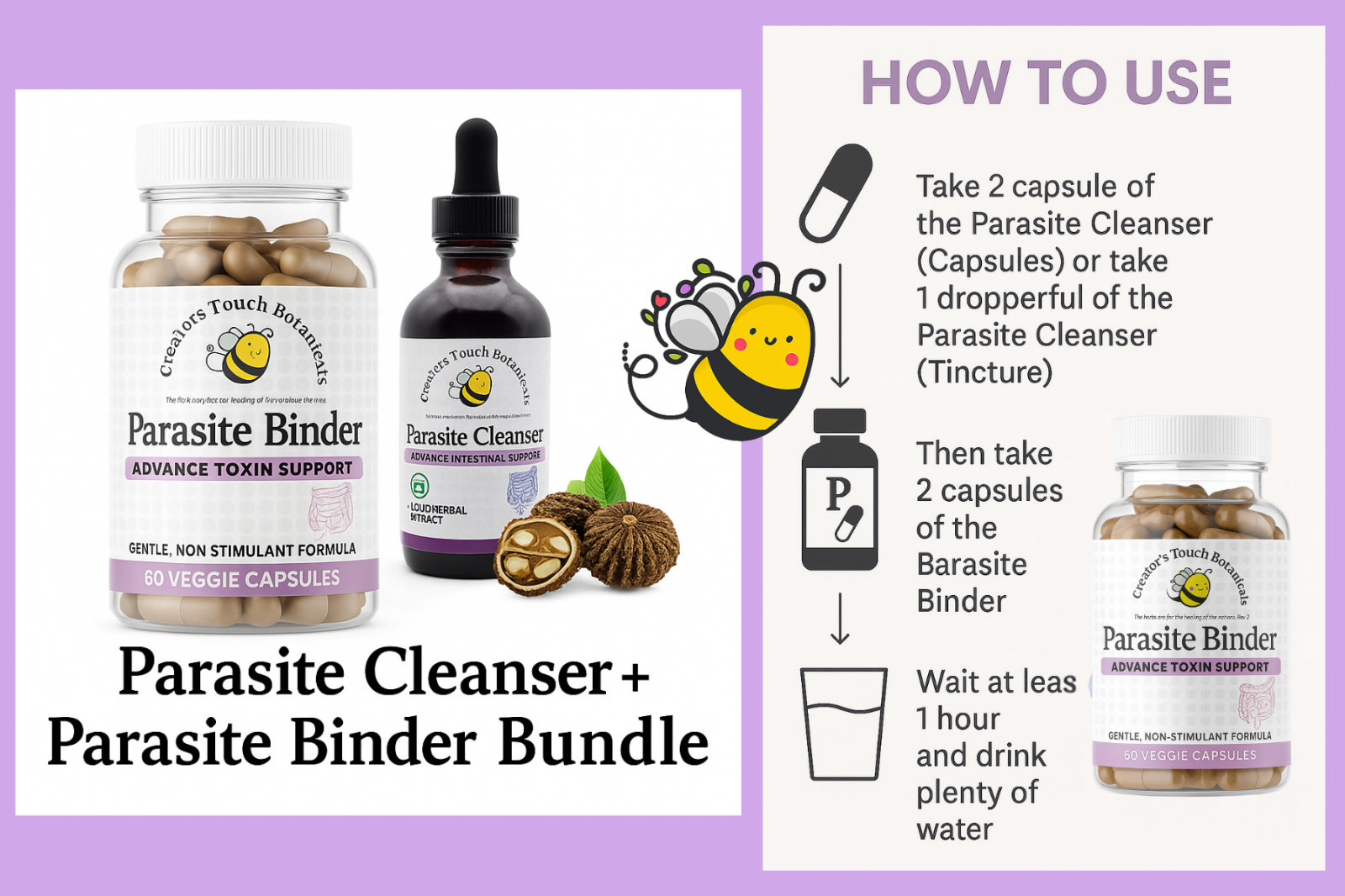 Cleanse, Bind, and Detox Naturally — The Complete Kit from Creator’s Touch Botanicals Experience full-body support with our Parasite Cleanser + Binder Detox Kit , carefully crafted to assist the body’s natural cleansing cycle. : 🌿 Your Cleanser and Binder Parasite Cleanse Detox Kit – Alcohol-based Tincture + Binder Capsules | Natural Formula Binder Parasite Binder Capsules – 60 ct | Intestinal Detox Support | Charcoal + Bentonite + DE | Creator’s Touch Botanicals All kits come with our Parasite Binder (60 capsules) to help bind and escort waste and toxins from the body.* 🌟 Why Customers Love This Kit : Plant-based ingredients, no artificial fillers Easy-to-follow instructions included Supports internal balance & regularity* Includes both cleanse + binding phase Small-batch crafted in the USA ✅ Kit Includes : 1 Bottle of Parasite Cleanser Alcohol based tincture 1 oz 1 Bottle of Parasite Binder (60 capsules) Free shipping & fast processing- Usually ships within 2-3 days Gentle Internal Detox with Nature’s Binders – 60 Capsules Binder Formula Support your body’s natural detox process with our Parasite Binder Capsules , thoughtfully formulated to help bind and escort waste, gas, and unwanted materials from the digestive tract. This 60-count bottle provides a powerful blend of natural binders and soothing herbs to promote gut clarity and comfort. 🌿 Key Ingredients: Activated Charcoal – Supports gas and toxin binding Bentonite Clay & Diatomaceous Earth – Help sweep and bind debris in the intestines Slippery Elm & Marshmallow Root – Gentle mucilage for lining and soothing digestion Clove Powder – Traditionally used to support a balanced internal environment ✅ Product Highlights: Plant-based ingredients, no fillers or artificial additives Gentle and non-stimulant formula Designed for use during cleansing protocols or on its own Made in small batches in the USA Pair with our Parasite Cleanser Tincture or Capsules for a complete detox routine. This kit is for the Alcohol Free Glycerite Option. 📦 Includes: 60 veggie capsules | Suggested use: 2 capsules daily with water. Alcohol-Based Parasite Cleanser – Tincture (1 oz) Crafted with care, this gentle alcohol-based formula supports the body’s natural cleansing process using traditional herbs. Made with grain alcohol. Use alone or pair with our Parasite Binder for a complete detox system.