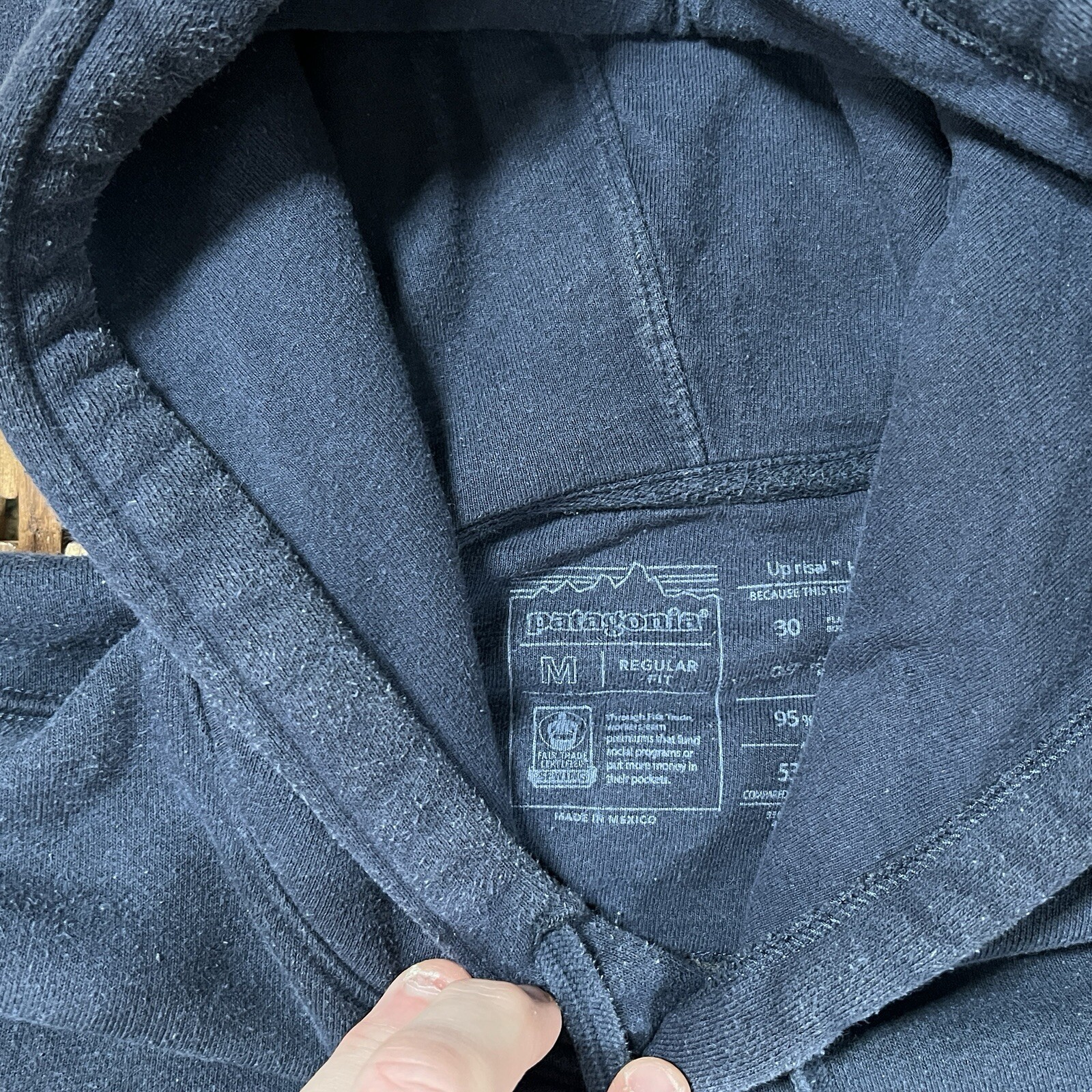 This is a Patagonia P-6 Logo Uprisal Hoodie in size Medium. The hoodie features a graphic print of the brand logo on the front, a hood with drawstring closure, long sleeves, and pockets. It is designed for outdoor activities and has a regular fit. The color is blue, and it is machine washable. Made in Mexico, it is suitable for winter, fall, and spring seasons for activities like gym training, walking, and hiking.
