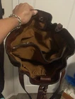 This beautiful Patricia Nash tote bag is perfect for any occasion. The drawstring closure and double handles make it easy to carry, while the tassel accents and gold hardware add a touch of elegance. The bag is made of high-quality brown leather and lined with soft suede, providing ample protection for your belongings. With a spacious interior measuring 16 inches in width, 11 inches in height, and 5 inches in depth, this large tote bag is ideal for travel, parties, workwear, and more. The bag also comes with a charming bag charm accessory and a durable leather handle/strap material. Get your hands on this classic and timeless piece from Patricia Nash's 10th anniversary collection today.