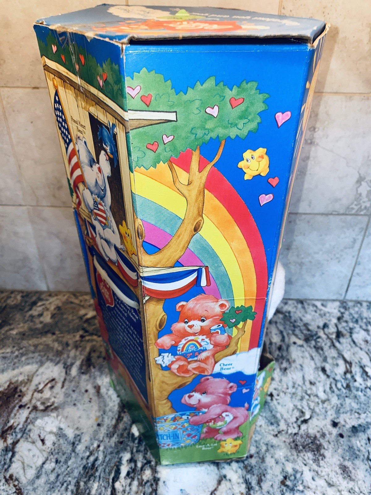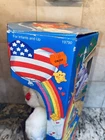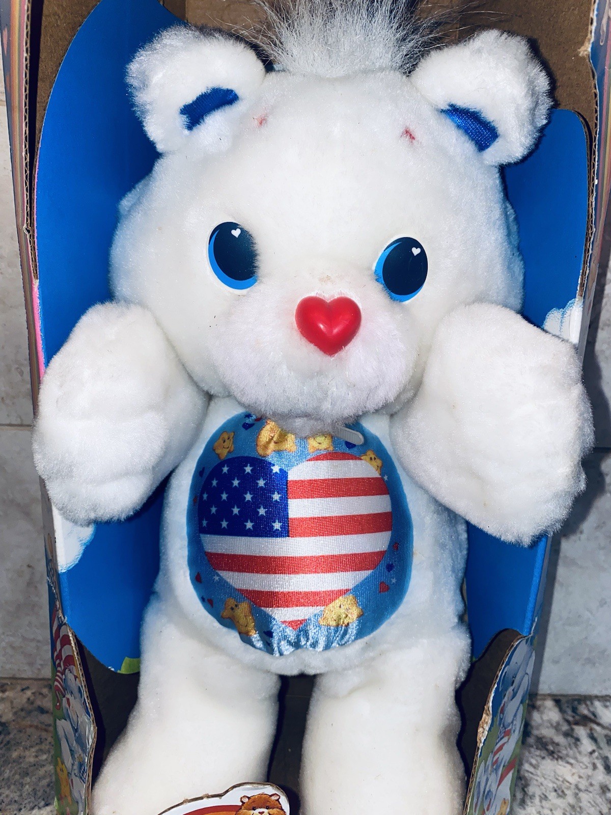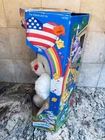 The product is a vintage Kenner Care Bear plush doll from 1991, featuring a patriotic theme with a white bear and blue eyes. This 12-inch bear comes in its original unopened box, making it a rare find for collectors. Made of synthetic fiber, this Care Bear is part of the original Care Bears franchise and is a perfect addition for fans of vintage toys and patriotic memorabilia.