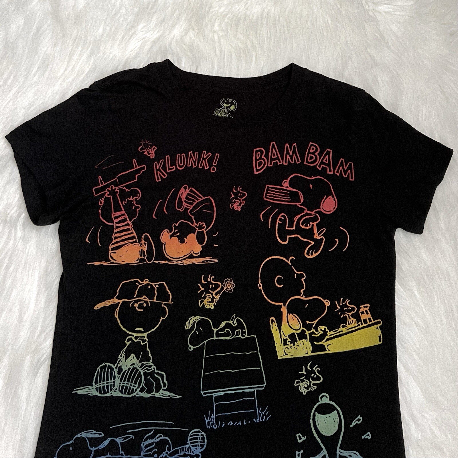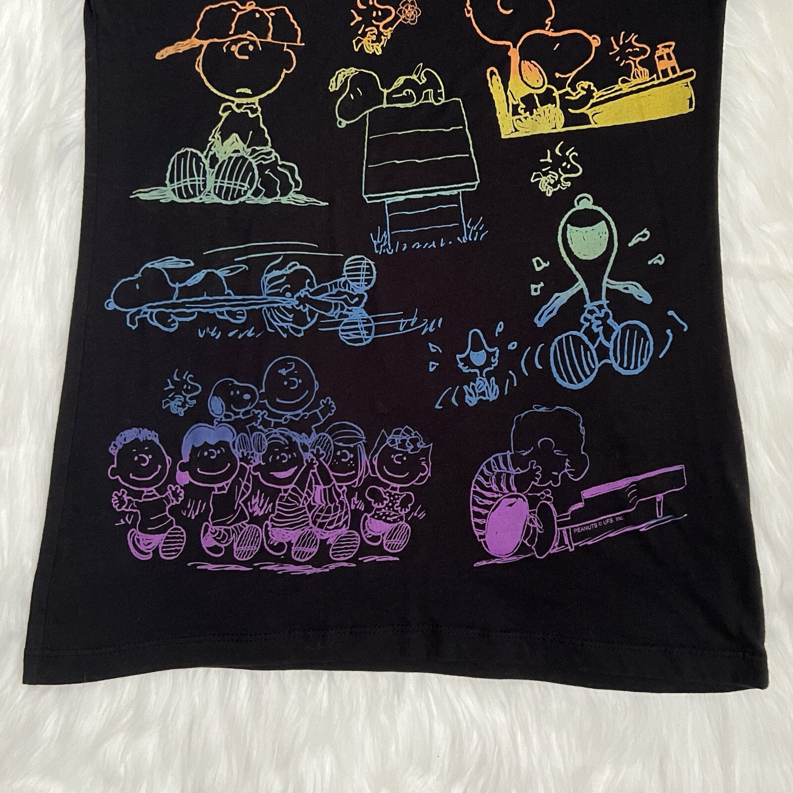 Peanuts Black Slim Fit Top with Rainbow Graphics Size L (fits more like a S/M) 50% Cotton 50% Polyester #Peanuts #Snoopy #Rainbow #Charliebrown Approximate Measurements (straight across): Pit to pit 16.25” Length 25.5” 4.0