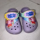 The product is a pair of Crocs Toddler Shoes featuring a Peppa Pig design, in a vibrant purple color. They are slip-on clogs with a casual style, suitable for unisex babies and toddlers. These shoes have a UK shoe size of 5 and a US shoe size of 4, with a medium shoe width. Manufactured in 2022 in Vietnam, they are made of synthetic upper material and have a rubber outsole for walking activities. The insole and closure are both made of rubber for comfort and ease of wear.