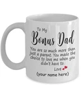 Personalized Bonus Dad Mug For Step Father Or Father In Law Fathers Day Gift For Product Details.. This high quality 11oz. ceramic white mug has a premium hard coat that provides crisp and vibrant color reproduction sure to last for years. Perfect for all hot & cold beverages. The highest quality printing possible is used. It will never fade no matter how many times you wash it. Material: 100% Ceramic. Print both sides. Dishwasher and Microwave Safe. High Gloss + Premium White Finish. Printed in the U.S.A. Personalized & Custom. We support personalized and custom mug to add custom, when placing an order, you can add notes to the "order note" in shipping address section. Also you can contact us directly via message. Shipping Info. Ready to ship in 1 to 2 business days, All products are made-to-order and proudly printed in the United States. Shipped by USPS and DHL, You will receive your order in 5-7 days. Replace & Refund. All products are defective during shipping broken, chipped will be replaced free of charge. You are not satisfied with the product, we will refund 100% money to you. If any other issues arise, please do not hesitate to message, we would be more than happy to assist you.