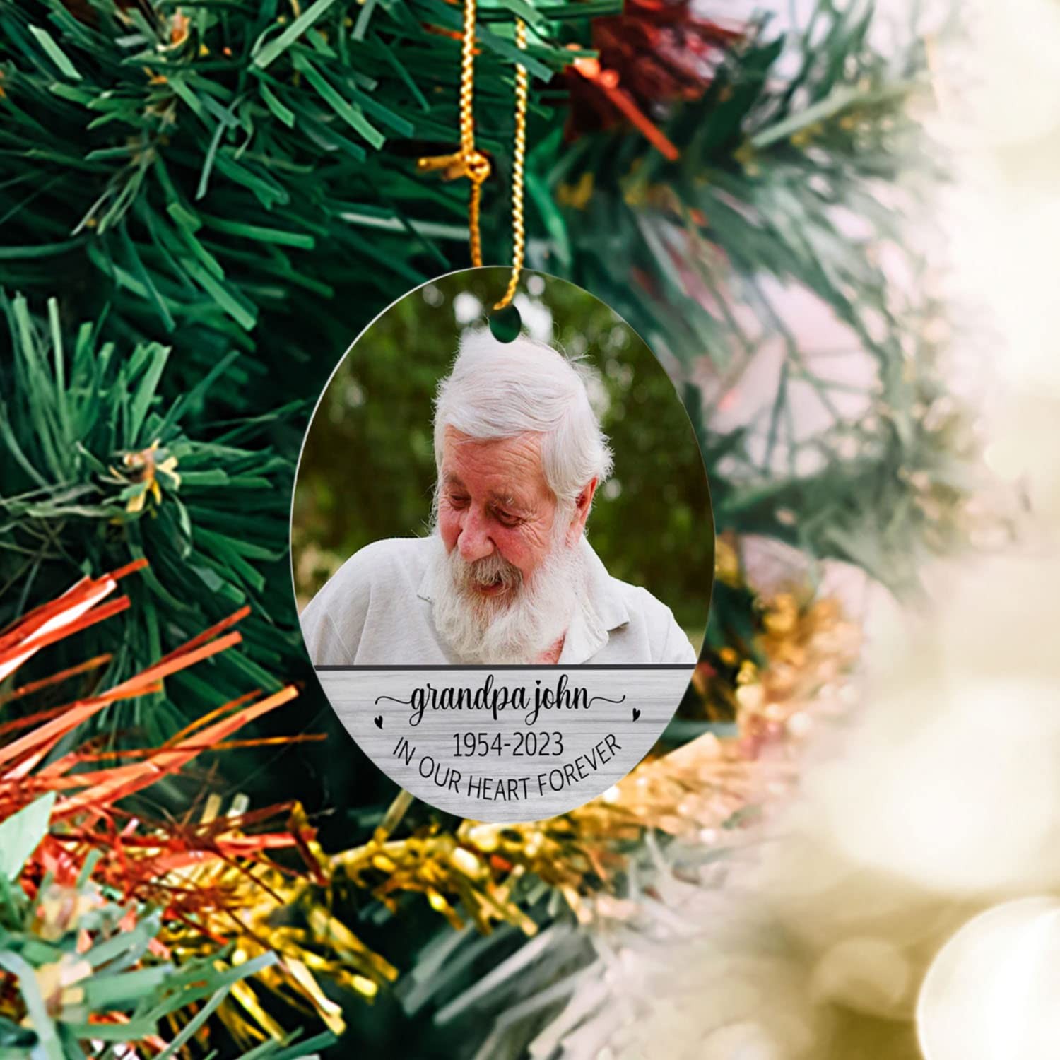 Forever in Our Hearts Photo Christmas Ornament, Personalized Grandpa Picture Frame Memorial Christmas Ornament, Customized Name Photo Year Ornament Xmas Tree, Grandpa Picture Ornament Keepsake Gift ღ Celebrate the loving memories and create keepsake moments with this Personalized Christmas Ornament Our ornament is crafted from durable MDF with a high-gloss plastic finish so your designs last a lifetime, vibrantly printed from edge-to-edge on 1-side. Each ornament is equipped with a festive gold cord for easy hanging on the Christmas tree, doors, windows, walls, wherever you want to decorate. ღ Are You Looking for A Unique Gift To Commemorate the holiday in your own home ? This personalized Christmas ornament is just what you are looking for! Our customized ornament makes a lovely gift idea for Family / Grandpa / Grandma / Mom/ Dad... This beautiful ornament is not only for Christmas, but also as gifts for engagements, weddings, anniversaries or any other memorable day. ☛ Please feel free to reach out to us if you have any problems with our products. We will try as much as we can to meet your needs because your satisfaction is our priority. [PERSONALIZED CHRISTMAS ORNAMENTS]: The most beautiful and special time of the year has come! Personalize your holidays with our custom Christmas Ornament. Great keepsake gift for Family / Grandpa / Grandma / Mom/ Dad...It's sure to become a beloved part of their holiday celebration. [HOW TO CUSTOMIZE]: Click "Customize Now" button, upload your photo, enter your text. Let's start to design your own beautiful ornament to commemorate the special day in your own home. [MATERIAL]: Crafted from durable MDF with a high-gloss plastic finish so designs last a lifetime. 2.75" tall, 1/8 thick, 0.5 oz, one-sided print. Vibrantly printed from edge-to-edge via Sublimation. [EASY TO USE]: Each ornament includes a gold hanging cord, which is easily to hang on X-mas trees, doors, windows, walls and anywhere you want to decorate. Hanging this unique christmas ornament to increase the festive atmosphere and enjoy the holiday!!! [SATISFACTION GUARANTEE]: If you have any question with your order, please feel free to contact us at any time, we are happy to help you in every possible way. Your satisfaction is our ultimate goal.