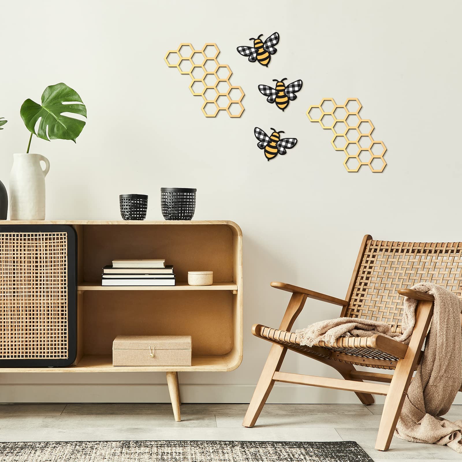 Peryiter 5 Pcs Metal Bee Wall Art Farmhouse Honey Bee Honey Comb Decor Wire Metal Wall Decor Hanging for Living Room Garden Bedroom Office Home(Stylish Color) What You Can Get: you can get 5 pieces of hanging art ornaments in this package, including 3 pieces of bee shaped decors and 2 pieces of honeycomb shaped decors, cute and eye catching, to keep your room from being dull and monotonous Reliable and Reusable: this honey bee decor is made of metal material, reliable and unbreakable, long lasting and sturdy, not easy to break or fade, smooth to touch, lightweight and thick, providing you with a pleasant use experience, so you can use it with confidence Decorative and Eye Catching: our bee wall decor is mainly printed with a black and gold color, and the bees adopt plaid and stripe elements, so you can hang it in many places, such as windows, mantels, fireplace, doors, counters and more, full of a sense of elegance and color in your home and room Proper Size to Decorate: our bee shaped decors are about 3.94 x 2.95 inches/ 10 x 7.5 cm and these honeycomb shaped decors are about 7.87 x 7.87 inches/ 20 x 20 cm, suitable and portable, you can use this metal outdoor wall art to decorate your space conveniently Variety of Occasions: this bee decor features an attractive color and adorable appearance, suitable to display in different places, like hallway, kitchen, patio, porch, bathroom, bedroom, living room and so on, can well blend with your various ornaments Features: Ideal and delicate gifts: This honeycomb art can be served as delicate gifts for your family, relatives, friends and colleagues as housewarming gifts, birthday gifts and Christmas gifts, warm and ideal. Brighten up your space: With a noticeable and creative shape, our bee themed kitchen decor can match well with a variety of styles and ornaments, making your party more interesting and comfortable. Specifications: Material: metal Color: black and gold mainly Size: Bee shaped decors: about 3.94 x 2.95 inches/ 10 x 7.5 cm Honeycomb shaped decors: about 7.87 x 7.87 inches/ 20 x 20 cm Package includes: 5 x Bee kitchen accessories Notes: Manual measurement, please allow slight errors on size. The color may exist a slight difference due to different screen displays. Shipping We offer FREE shipping on all orders! We ship within Three business days of payment, usually sooner. We use a selection of shipping services such as UPS, FedEx, USPS etc. We only ship to the lower 48 states, no APO/FPO addresses or PO Boxes allowed. Local pickups and combined shipping options are not provided at this time. Return You can return a product for up to 30 days from the date you purchased it. Any product you return must be in the same condition you received it and in the original packaging. Please keep the receipt. Payment We accept payment by any of the following methods: PayPal Please pay as soon as possible after winning an auction, as that will allow us to post your item to you sooner! Feedback Customer satisfaction is very important to us. If you have any problem with your order, please contact us and we will do our best to make you satisfied. Contact Us If you have any queries, please contact us via ebay. We usually respond within 24 hours on weekdays. Please visit our eBay store to check out other items for sale! Thank you for shopping at our store.