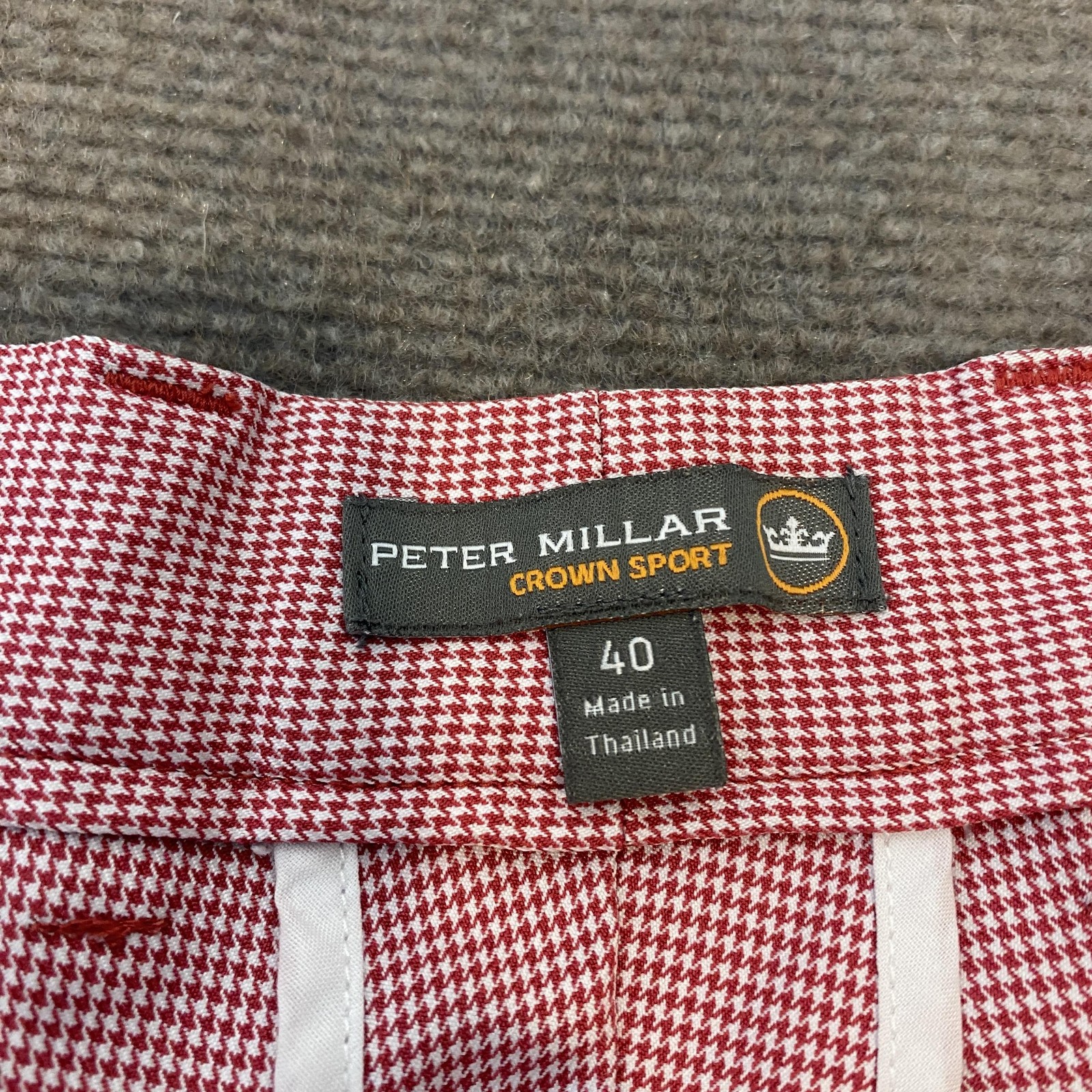 Peter Millar Crown Sport Shorts Mens 40 Red White Micro Houndstooth Golf Condition: Gently worn, no visible flaws. Shorts show minimal signs of prior use and are in excellent used condition. 100% polyester shell for lightweight, breathable comfort—ideal for golf, travel, or casual wear. Distinctive red and white micro houndstooth pattern throughout fabric, classic flat front design. Belt loops, two front side pockets, and two buttoned back pockets for practical storage. Signature Peter Millar crown logo embroidered above the right back pocket. Tag size: 40 (Mens) Made in Thailand Great for warm weather and performance wear. Golf, resort, or vacation style staple.