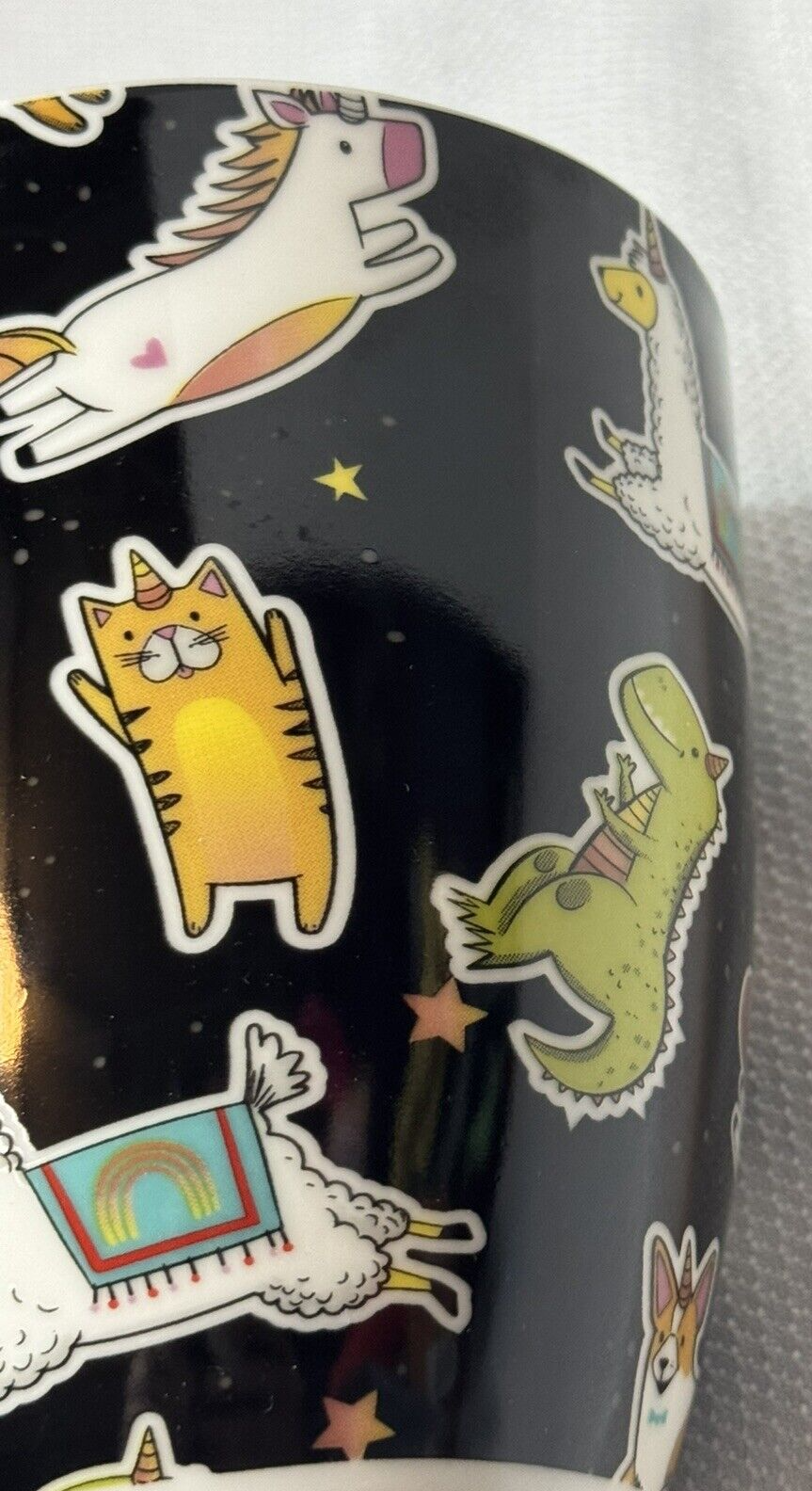 Sip your favorite beverage in style with this Pfaltzgraff porcelain coffee mug, featuring a playful and whimsical unicorn design that's sure to add a touch of magic to your day. The tapered shape and 18-ounce capacity make it perfect for your morning coffee or evening tea, and the sleek black color ensures it will complement any table setting. Designed with convenience in mind, this mug is both dishwasher and microwave safe, simplifying your daily routine. It stands at a comfortable height of 4.5 inches, making it easy to hold and enjoy your hot or cold beverage on any occasion. Whether it's for personal use or as a charming gift, this Pfaltzgraff mug is a delightful choice for anyone who loves a unicorn theme or simply appreciates a well-made cup.