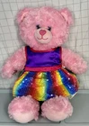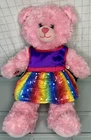 This adorable pink plush bear from Build-A-Bear Workshop is ready to make your heart skip a beat! With its charming blue eyes and colorful rainbow dress, this bear is sure to brighten up any room. Perfect for collectors or as a gift for someone special, this bear is made to be loved. Featuring a cute and cuddly design, this bear is sure to bring joy to anyone who receives it. The plush material and attention to detail make this bear a must-have for fans of the Build-A-Bear franchise. Don't miss out on the chance to add this lovely pink bear to your collection today!