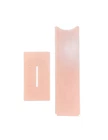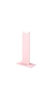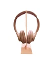 Pre-owned/in good condition - pink headphone stand made by Okinuma. It is made of a sturdy plastic material with a rectangular base and a curved top to hold the headphones in place. Headset has some marks due to use but still works great.