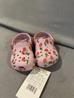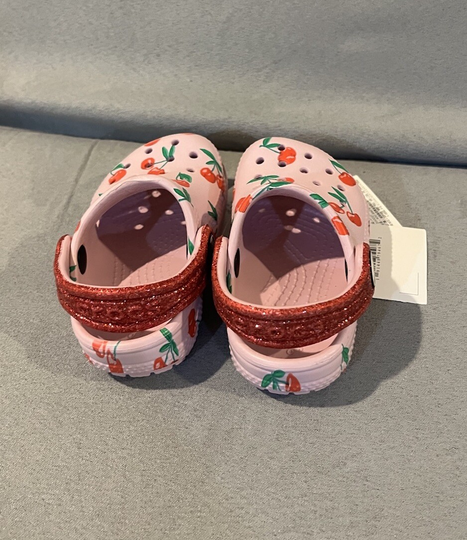 -Adorable, bright ballerina pink color pair of Crocs with a fun glittery strap and cherry print. -New with tags! -Size 4c (toddler)