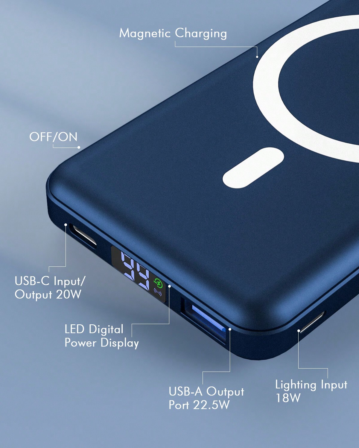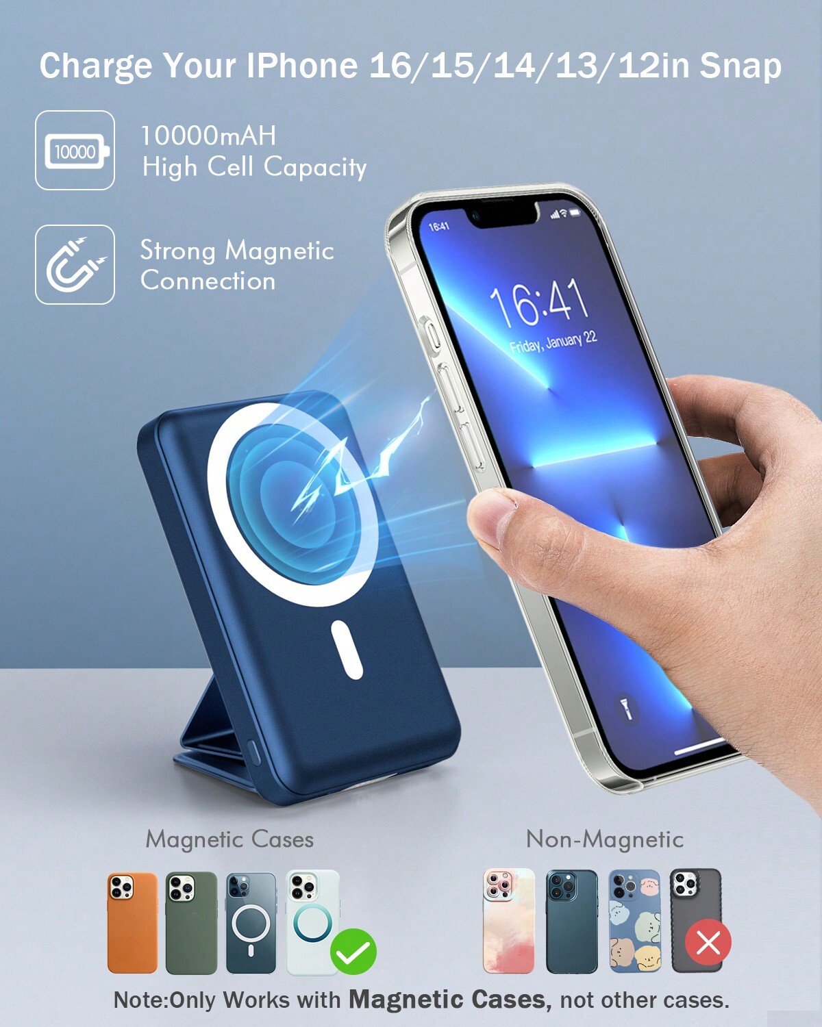 "Great Compatibility Power Bank For iPhone: This portable charger power bank is perfectly designed for iPhone 16, iPhone 16 Plus, iPhone 16 Pro, iPhone 16 Pro Max, iPhone 15, iPhone 15 Plus, iPhone 15 Pro, iPhone 15 Pro Max, iPhone 14, iPhone 14 Plus, iPhone 14 Pro, iPhone 14 Pro Max, iPhone 13, iPhone 13 mini, iPhone 13 Pro, iPhone 13 Pro Max, iPhone 12,iPhone 12 mini,iPhone 12 Pro, iPhone 12 Pro Max; (Note: We recommend charging with MagSafe phone case or without cases to get enough suction) Strong Magnetic & Fast Charging Power Bank: Magnetic portable charger adopts the latest magnetic suction technology, charging immediately after snap. Support 5W, 7.5W, 10W and 15W Max wireless charging, 22.5W max USB-A PD output and max 20W USB-C output; Support max 18W Lighting input and max 18w USB-C input; The wireless charger can charge 3 Devices at the same time, shared charging with no waiting. The battery pack charger portable for iphone ensures faster charging speeds 10000mAh Large Capacity & LED Digital Display: 10,000 mAh large capacity of the portable power bank and high density battery design can provide all-day power; The portable charger iphone can charge 2 times for iPhone16/15/14/13/12 Pro, about 1.5 times for iPhone 16/15/14/13/12 Pro Max & iPhone 14/15/16 Plus; You can know how much battery is left with the clear digital on smart LED digital display, No more guessing and worrying Magic Foldable Stand: The magnetic power bank for iphone has a foldable kickstand to hold your iPhone(horizontally or vertically)for a comfortable viewing angle, even when charging can use the iPhone, no more worrying about charging distance and say goodbye to messy wires. And the portable iphone charger uses soft silicone material to protect your phone from damage while wireless charging Mini Design Portable Phone Charger: Mini design allows you to easily put the wireless power bank into your pocket or backpack (4.08*2.67*0.85 inches); It will not block the camera during use; Lighter weight (only 0.4 pounds) allows you to easily use it with your iPhone Superior Safety: This portable power bank built-in low-temperature ice cores and smart chip, has comprehensive multi protect safety system specifically includes temperature control, overcharge protection, short circuit protection, etc., to protect your iphone power bank and charging safety What You Get: 10000mAh Magnetic Power Bank x 1, USB-C Charging Cable x 1, User Manual x 1. Podoru professional technical support and always friendly customer service Only Compatible with Designed specifically for iPhone 16 / iPhone 16 Plus / iPhone 16 Pro / iPhone 16 Pro Max, iPhone 15 / iPhone 15 Plus / iPhone 15 Pro / iPhone 15 Pro Max, iPhone 14 / iPhone 14 Plus / iPhone 14 Pro / iPhone 14 Pro Max, iPhone 13 / iPhone 13 Pro / iPhone 13 Pro Max / iPhone 13 Mini, iPhone 12 / iPhone 12 Pro / iPhone 12 Pro Max / iPhone 12 Mini Smart LED Digital Display A clear smart led digital power display, you can easily see the remaining power of this external battery. Foldable Stand Built-in foldable kickstand that provide you with a comfortable viewing angle and free hands. Support For Support wireless charge 5W/7.5W/10W/15W devices and 22.5W USB-C output charge . The Foldable mag-safe battery pack can charge 3 devices at the same time. Notes: 1. For best results, use a power adapter with at least 12W output (not included). 2. Not compatible with non-MagSafe phone cases, such as Otterbox defender cases. 3. Wireless power bank might produce heat during charging, which is normal as long as it is below 55℃."