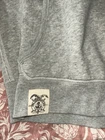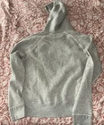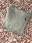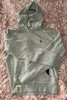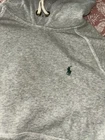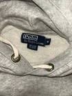 This is a Polo Ralph Lauren gray hoodie sweatshirt for men in size M. The hoodie features a drawstring closure, long sleeves, and a classic fit. Made of a cotton blend fabric, it includes a stitched logo accent on the front. The style is a pullover with a hood, pockets, and is suitable for activities like gym training, walking, and running. The design themes include animals, university, preppy, and the Polo Ralph Lauren logo. All sales final. No returns