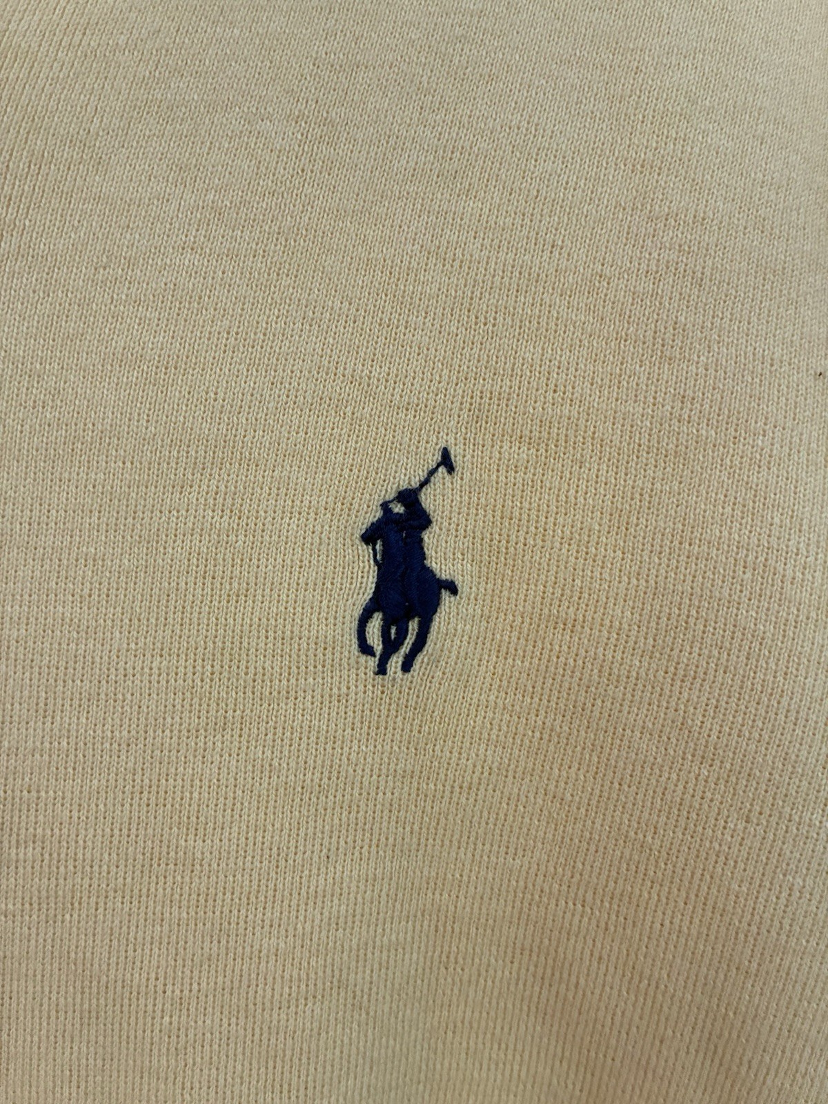 Polo Ralph Lauren Men Solid Yellow 100% Pima Cotton V-Neck Long Sleeve Sweater S. Condition is pre-owned. Smoke free, pet free home. Shipped via USPS Ground Advantage. In good condition. There are light stains on the front and sleeve. Free of rips.