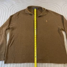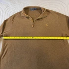 The Polo Ralph Lauren Men's Size XL Brown Estate Rib 1/4 Zip Heavyweight Sweater is a classic and preppy pullover sweater made from tight-knit cotton fabric. Featuring a solid brown color with embroidered logo accents, this sweater is perfect for casual occasions in the winter, fall, and spring seasons. With a mock neck and long sleeves, this sweater offers a comfortable fit for men who appreciate quality and style in their clothing. Ideal for walking and golfing, this heavyweight sweater from Polo Ralph Lauren is a timeless addition to any wardrobe.