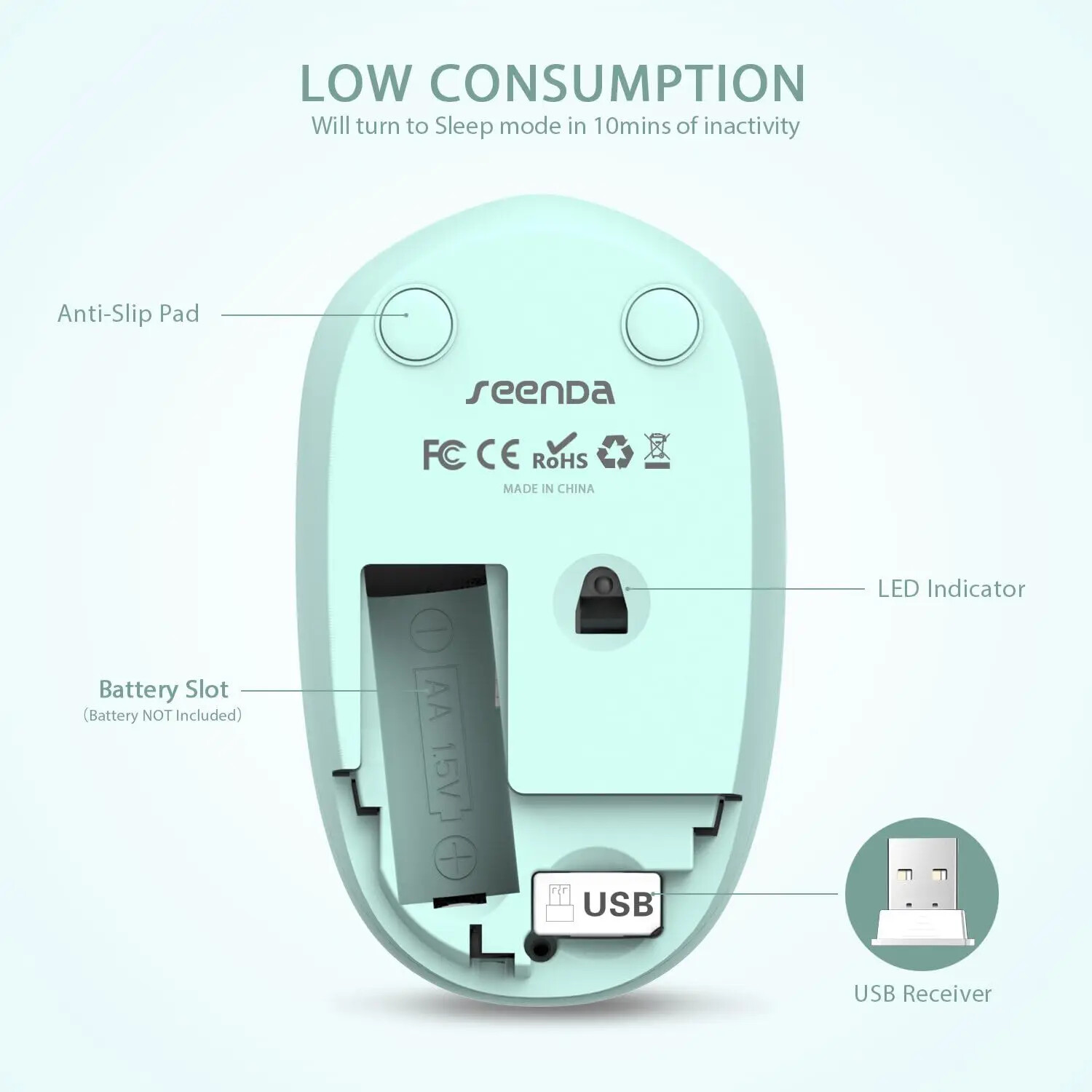 Quiet Wireless Mouse The wireless mouse features noiseless click technology, providing a quiet and peaceful working environment. This allows you to work or use the mouse in any setting without disturbing others around you. 2.4GHz STABLE CONNECTION 2.4GHz wireless transmission technology provides a powerful and reliable connection up to 33ft. Comfortable & Responsive This wireless mouse offers a comfortable grip for extended use, and the advanced sensor ensures silent clicks & nice responsive. Low Consumption It takes only 1 AA Battery to operate this mouse, and the wireless mouse will turn to sleep mode in 10mins of inactivity for energy saving, can be easily activated by clicking any buttons.