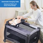 【MULTI-PURPOSE CRIB】--The design of the changing table allows the mother to easily change diapers, and the comfortable bassinet provides a place for the baby to rest. The storage bag will provide you everything when you’re ready to change diaper for your baby. 【CONVENIENT & DURABLE NURSERY CENTER】--There are two wheels with brakes at the bottom of the baby playard so that it can move flexibly. This nursery center is composed of strong frame and thick fabric so that it can hold the baby weights up to 33lbs. 【EASY TO ASSEMBLE】Easy to put the playard together without any tools. The mesh design provides a better visibility for parents to observe the baby at any time. The wide space allows the baby to practice standing and playing after removing the bassinet. 【DETACHABLE & FOLDABLE DESIGN】--The changing table, storage bag, bassinet and canopy can be easily removed from the baby playard. And the playard can be quickly folded up without extra tools. The handbag helps you store the folded crib and take the crib out for travel. 【DETACHABLE CANOPY with 2 TOYS】-- The detachable canopy can protect your child's eyes from strong light. The two hanging toys can attract the baby's attention, not only promoting the baby's visual development but also improving the grasping ability.
