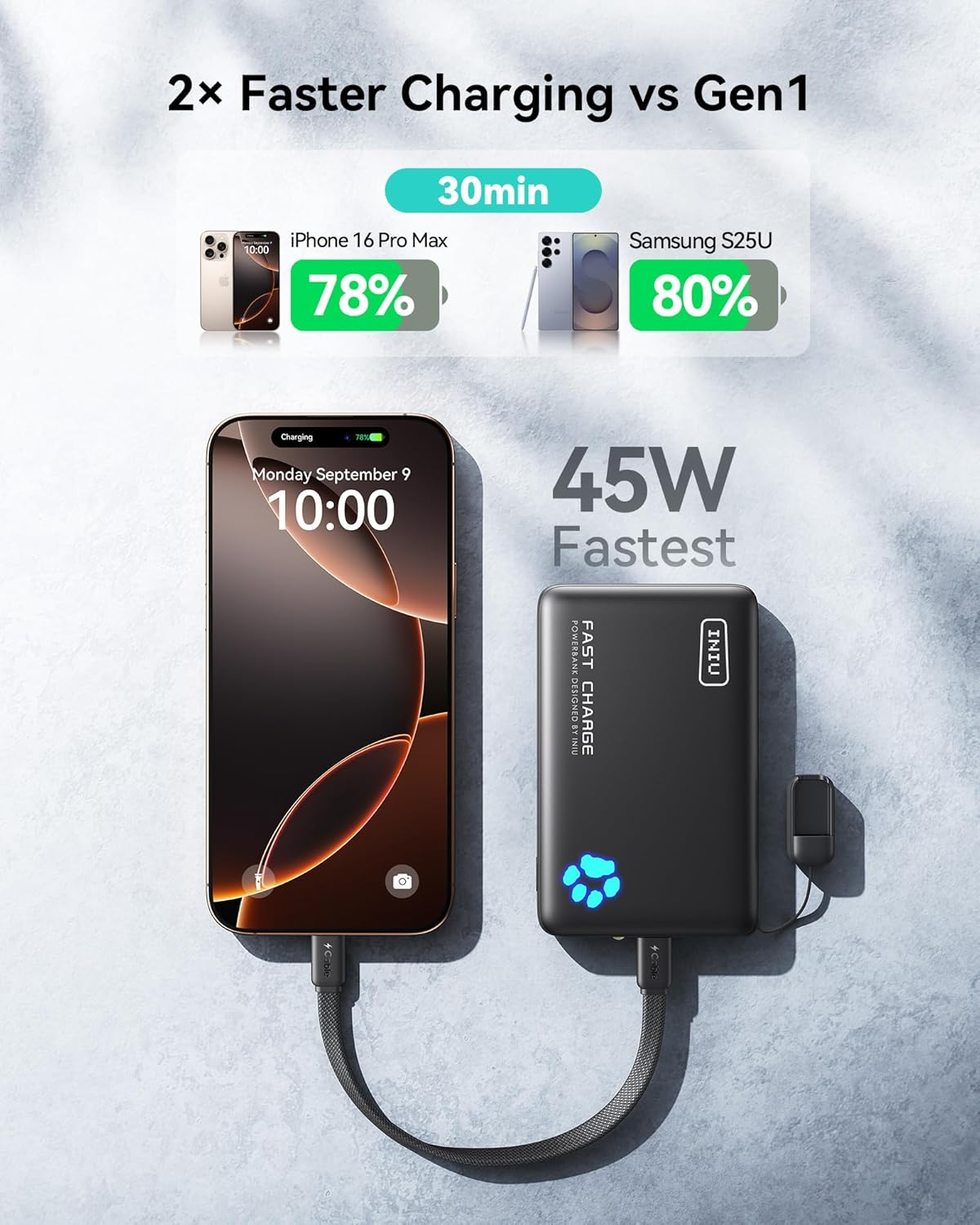 From INIU--the SAFE Fast Charge Pro: Experience the safest charging with over 38 million global users. At INIU, we use only the highest-grade materials. Industry First-Seen High-Density TinyCell: INIU's latest 10,000mAh power bank features the market's first high-density cell, making it 30% smaller and 15% lighter than others with the same capacity. Charge iPhone 16 to 60% in 25 Mins: Equipped with a powerful integrated 45W chip. It charges an iPhone 15 to 60% in just 25 mins. Only 5% Got USB-C IN & OUT: INIU stands out with its unique dual USB-C ports, both for input and output. Unlike others only recharge via USB-C port, INIU can charge all devices with your USB-C cables directly. Charge 3 Devices Together: Unlike most devices on the market, our power bank features 2 USB-C ports and 1 USB-A port, allowing charge 3 devices at once in emergencies. What You Get: INIU 10000mAh portable charger*1, 0.12M/0.4ft Lanyard USB-C to USB-C Cable*1, user manual*1, and Industry-Leading 3-Year INIU Care, plus Lifetime Technical Support.. Product Description 1 45W Max Fast Charge 2 Pass-Through Charge 3 2H Recharge 1 3-Year INIU Care 2 Wide Compatibility 3 Temp°Guard 3.0 Comparison Add to Cart Add to Cart Add to Cart Add to Cart Add to Cart Customer Reviews 4.6 out of 5 stars 74,202 4.6 out of 5 stars 816 4.5 out of 5 stars 412 4.6 out of 5 stars 48,783 4.1 out of 5 stars 823 Price $18.69 $ 18 . 69 $24.98 $ 24 . 98 $36.99 $ 36 . 99 $29.99 $ 29 . 99 $19.99 $ 19 . 99 For Phone ≈2 Charges ≈2 Charges ≈4 Charges ≈4 Charges ≈1 Charge Recharge Time 2h 2h 3.9h 5.4h 2.5h Cable Included Detachable USB-C Cable Built-in USB-C Cable Built-in USB-C Cable Detachable USB-C Cable USB-C to C Included Battery Level Display PawPower Display PawPower Display Digital Display Digital Display Digital Display Size / Weight 4.3 x 2.7 x 0.7in / 6.4oz 4.3 x 2.7 x 0.7in / 6.3oz 4.5 x 2.9 x 1.1in / 11.5oz 4.1 x 2.8 x 1.2in / 11.1oz 3.1 x 1.5 x 1.0in / 3.5oz