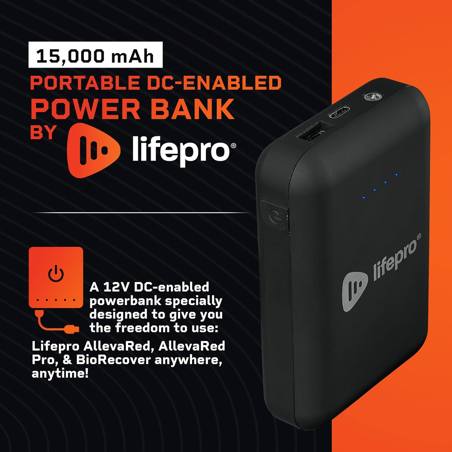 SPECIALLY DESIGNED FOR YOUR LIFEPRO GEAR - Plug your AllevaRed, AllevaRed Pro, & BioRecover into the special 12V DC Port of the portable charger power bank & take your wellness experience on-the-go! LONG LASTING POWER BANK IN YOUR POCKET - Get multiple hours of use from a single charge of your portable power bank with a powerful 15,000 mAh capacity! CHARGE YOUR MOBILE DEVICES TOO - Use the power bank battery charger as a cell power bank to top up your mobile devices thanks to the USB 3.0 port. CABLES & ADAPTER INCLUDED - Packaged for your convenience, the battery pack comes with a USB Power Adapter, USB to USB-C Charging Cable, and the 1.35 mm to 2.1 mm DC cable for your Lifepro gear! CHARGE IT UP VIA USB-C - Prepare yourself with mobile battery power before you get going & charge up your power bank via the convenient USB-C charging port. Product Description