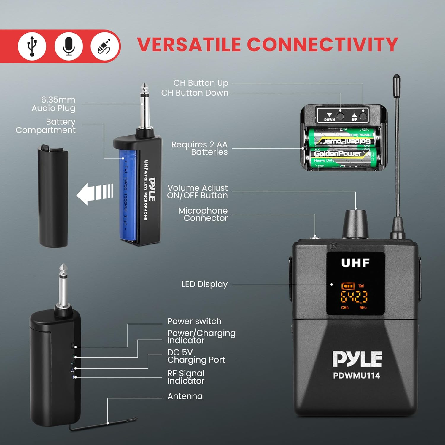 UHF NARROW BAND: These cordless microphones for singing feature UHF audio transmission for unsurpassed performance w/ high signal over noise ratio for clear, distortion-free, crisp vocal & excellent sound reproduction unlike low-grade VHF unit SELECTABLE FREQUENCY RANGE: This wireless professional microphone features digital display w/ 8 channel selectable mic frequency range w/ low distortion. Enjoy cordless singing to karaoke music & mobility for energetic on-stage performance AUDIO RECEIVER: Pyle wireless microphone system includes a plug-in audio adapter receiver with ¼” (6.3mm) jack. Features integrated antenna for extended wireless range. It directly connects to amplifier, stereos, audio processors, and DJ mixer 160' FT OPERATION RANGE: The wireless microphone set features up to 160'+ ft. operation range & lets you move w/ ease without those annoying cords. Used for karaoke, classroom, office/business applications. Perfect for public audio & studio use EASY TO OPERATE: This microphone system is battery-operated & easy to control. Features independent & adjustable channel volume control, convenient power ON/OFF switch, LED indicator lights, & LCD digital display screen for frequency read-out System Features: - UHF Band Microphone System - Operation Range: Up to 160'+ ft. - LED Digital Display Readout Screens - Simple Setup & Hassle-Free Operation - AF & RF Audio Transmission Signal Strength Indicators - Independent & Adjustable Channel Volume Controls - Selectable Frequency Range: Up to (8) Channels - 1/4" Audio Output Jack - XLR Balanced Output Jack What’s in the Box: - Receiver Base - Beltpack Transmitter - Handheld Microphone - Headset Microphone - Lavalier Microphone - Power Cable Transmitter Specs: - RF Output: >10 dBm - Modulation Type: FM - Max Deviation: ± 40 KHz - Spurious Emission: > 55 dBc - Nominal Current Drain: Receiver Specs: - Signal / Noise Ratio: -105dB - Border Upon Channel Rejection: >70dB - T.H.D.: <1% - Audio Output Level: 0-300 mV - Dimensions 6.8 x 5.3 x 1.7 in - Power Supply: 110/220V (12-15V Power Adapter)