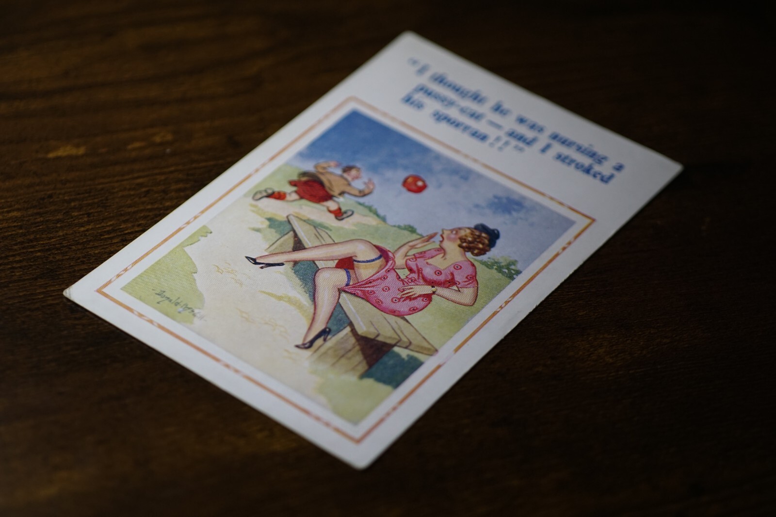 Postcard Seaside Comic Saucy Risqué Bench Stockings Constance Donald McGill 1855 "I thought he was nursing a pussy-cat- and I stroked his sporran!!" D. Constance Ltd. 22 Christchurch Rd. London Sw2 New Donald McGill Comic Series 1855 Unposted. Good vintage condition. No visible damage to any of the edges. All corners slightly bent. Dirt spots, discoloration, creasing, scratches, missing paint and stains marks may be visible on single or both sides of the postcard. Good condition for its age. Please look at the photos for condition details. Additional details : This postcard is quite far from what we know as English humour, marked by fine irony. What do we mean by saucy seaside postcards? The name was coined for cards featuring risqué images and innuendo. These often include images of figures scantily clad and in precarious positions. Many of these designs would not be deemed appropriate today and even at the time, as we will discover, people questioned their impact on the morality of their audience. Pedro, Fitzpatrick, Chas, Quip, L.B. Martin, Maurice, Ajw, Trow, Donald McGill were all an English graphic artists for seaside, risqué, comic satire, humour whose names has become synonymous with the genre of saucy postcards, particularly associated with the seaside (though they were sold throughout the UK). This cards mostly featured an array of attractive young women, fat old ladies, drunken middle-aged men, honeymoon couples and vicars. Many artists behind the designs were influenced by the one who has been called 'the king of the saucy postcard', Donald Fraser Gould McGill (28 January 1875 - 13 October 1962) 'Saucy Postcards' are often collected and appreciated for artistic skill, its power of social observation and earthy sense of humour. Even at the height of fame top artists only earned three guineas a design, but by the 2000s original artwork could fetch thousands of pounds. Keywords: Artist drawn illustration ; Edwardian ; Victorian ; Antique ; Early colour ; Double entendre ; Humorous ; Amusing ; Entertaining ; Innuendo ; Toilet humour ; Dirty jokes ; Rude joke ; Cheeky ; Funny situations ; Novelty ; Big boobs ; Buxom ; Plump ; Thicc ; Busty ; R andy ; Bawdy ; Foreplay ; Courting ; Pretty girl ; Sexy lady ; Sex ; Nude ; Nudes ; Nudist club ; Naturist club ; Naked women ; Naked man ; Naked couple ; Topless ; Nylons ; Stockings ; Love ; Romance ; Wedding ; Marriage ; Wife ; Husband ; Hubby ; Breezybums ; Koolbums ; Fabric ; Cloth ; Rag ; Towel Roller ; Blind garden fence ; Neighbour ; On bed ; On spoon ; Erectile dysfunction ; Holiday ; Bikini ; Beach ; Sand ; Bathing beauty ; Mouse trap ; Hole ; Plumber ; Engineer ; Deckchair ; Pub Inn ; Boomers ; Pardon ; Interruption