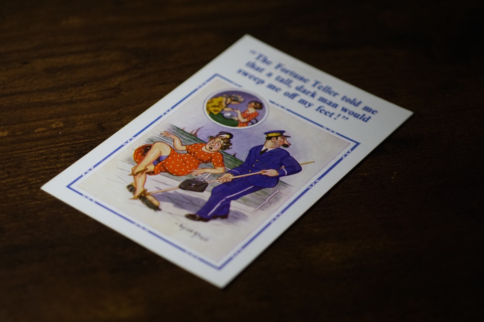Postcard Seaside Comic Saucy Risqué Fortune Teller Constance Donald McGill 2101 "The fortune teller told me that a tall, dark man would sweep me off my feet!" D. Constance Ltd. 22 Christchurch Rd. London Sw2 New Donald McGill Comic Series No 2101 Unposted. Good vintage condition. No visible damage to any of the edges. All corners slightly bent. Dirt spots, discoloration, creasing, scratches, missing paint and stains marks may be visible on single or both sides of the postcard. Good condition for its age. Please look at the photos for condition details. Additional details : This postcard is quite far from what we know as English humour, marked by fine irony. What do we mean by saucy seaside postcards? The name was coined for cards featuring risqué images and innuendo. These often include images of figures scantily clad and in precarious positions. Many of these designs would not be deemed appropriate today and even at the time, as we will discover, people questioned their impact on the morality of their audience. Pedro, Fitzpatrick, Chas, Quip, L.B. Martin, Maurice, Ajw, Trow, Donald McGill were all an English graphic artists for seaside, risqué, comic satire, humour whose names has become synonymous with the genre of saucy postcards, particularly associated with the seaside (though they were sold throughout the UK). This cards mostly featured an array of attractive young women, fat old ladies, drunken middle-aged men, honeymoon couples and vicars. Many artists behind the designs were influenced by the one who has been called 'the king of the saucy postcard', Donald Fraser Gould McGill (28 January 1875 - 13 October 1962) 'Saucy Postcards' are often collected and appreciated for artistic skill, its power of social observation and earthy sense of humour. Even at the height of fame top artists only earned three guineas a design, but by the 2000s original artwork could fetch thousands of pounds. Keywords: Artist drawn illustration ; Edwardian ; Victorian ; Antique ; Early colour ; Double entendre ; Humorous ; Amusing ; Entertaining ; Innuendo ; Toilet humour ; Dirty jokes ; Rude joke ; Cheeky ; Funny situations ; Novelty ; Big boobs ; Buxom ; Plump ; Thicc ; Busty ; R andy ; Bawdy ; Foreplay ; Courting ; Pretty girl ; Sexy lady ; Sex ; Nude ; Nudes ; Nudist club ; Naturist club ; Naked women ; Naked man ; Naked couple ; Topless ; Nylons ; Stockings ; Love ; Romance ; Wedding ; Marriage ; Wife ; Husband ; Hubby ; Breezybums ; Koolbums ; Fabric ; Cloth ; Rag ; Towel Roller ; Blind garden fence ; Neighbour ; On bed ; On spoon ; Erectile dysfunction ; Holiday ; Bikini ; Beach ; Sand ; Bathing beauty ; Mouse trap ; Hole ; Plumber ; Engineer ; Deckchair ; Pub Inn ; Boomers ; Cruise ; Cruise Ship ; Deck ; Polka dot ; Cleaner ; Broom