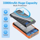 【Super Large Capacity】With 33800mAh premium Li-polymer battery-Wireless Solar Charger Power Bank. It can be recharged by via adapter and solar power.Super endurance, allow you get rid of the trouble of equipment battery running out. 【Outdoor Waterproof Wireless Power Bank】Equipped with a super bright LED flashlight, It can work continuously for up to 200 hours,This solar battery charger also has plus rugged ABS material and silicone,high elasticity and toughness,make it dustproof shockproof.Side compass design and one lanyard hole. With over 1500+ charging life cycles.Its a good choice for outdoor activity/Camping/wilderness trips/hikes/canyons/inclement weather/home emergencies. 【Compatible with Multiple Devices】Solar power bank is equipped with 15W Qi wireless fast charging,built-in 4 fast charging cables.compatible with all USB devices such as smartphones and tablets. NOTE: Use fast charging cable and adapter to achieve fast charging. 【High Performance】Solar powered battery charger has a built-in smart IC chip, which can accurately identify most mobile devices on the market and match the output power accordingly. The IC chip will also provide charging protection for the solar power banks, intelligently monitoring voltage and current. It can prevent your device from overcharging, overcurrent, overvoltage, short circuit, overheating and other potential hazards. For your device protection. 【Warm reminder】This solar charger passed UN38.3 and MSDS safety certification, can be safe to use. We also provide you with a complete after-sales service,Welcome to contact us anytime. Note: Solar charging is only an emergency backup solution, for normal use, please charge via data cable.power bank are made of high-quality materials, have a super large capacity, maybe a little heavy. 【notice】Before using the power bank for the first time,please give a full charge to it.