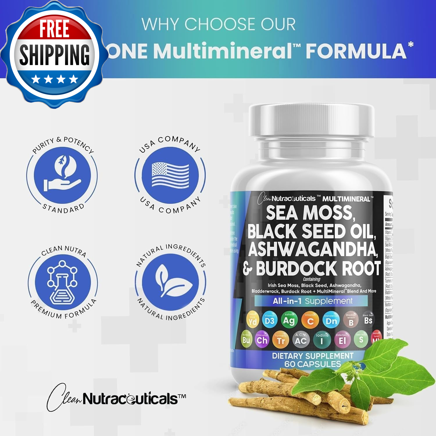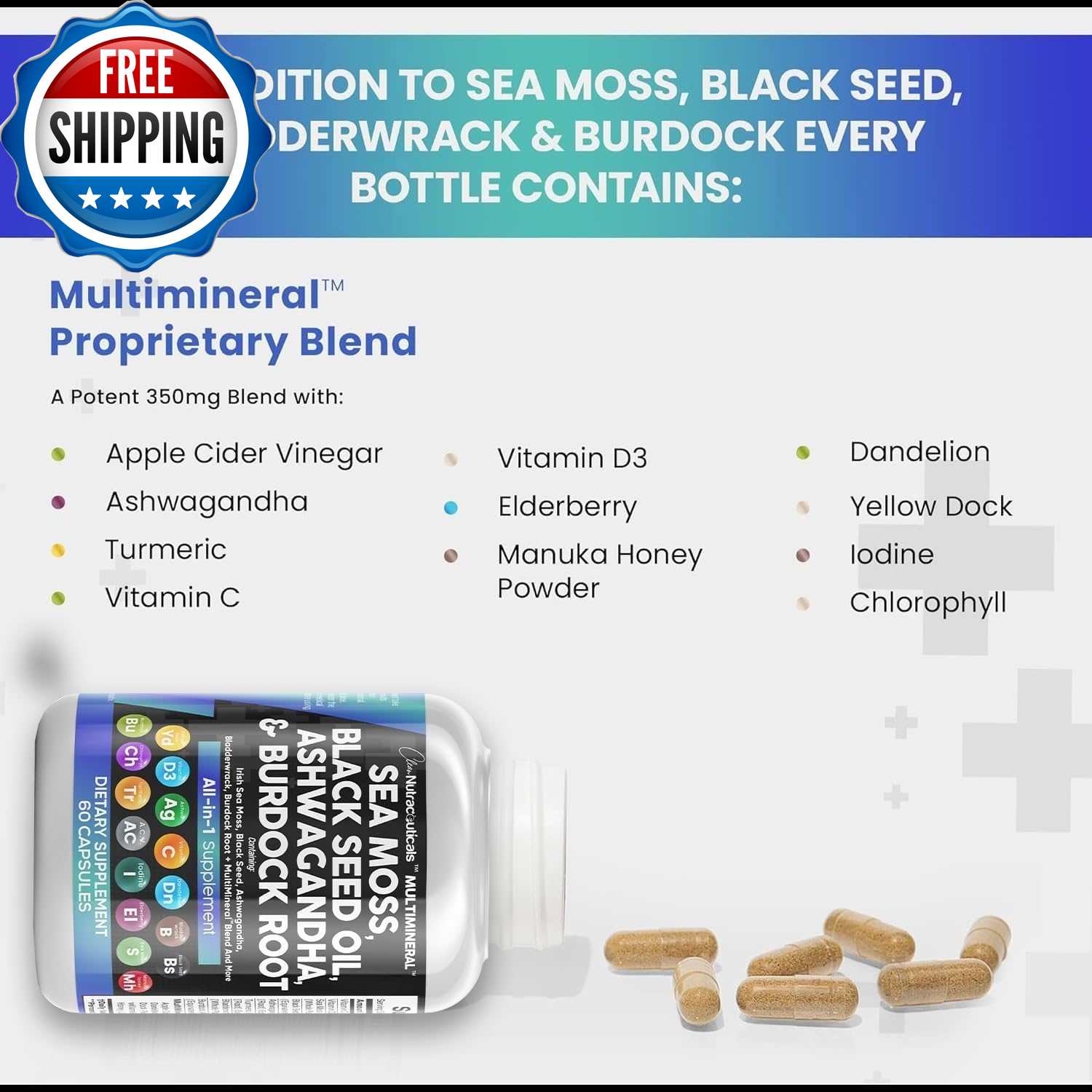 Sea Moss Black Seed Oil Ashwagandha Turmeric Bladderwrack Burdock & Vitamin C Vitamin D3 with Elderberry Manuka Dandelion Yellow Dock Iodine Chlorophyll ACV Clean Nutra Irish Sea Moss Capsules For Women and Men - Our Seamoss Pills and Black Seed Oil for hair includes 15 ingredients such as Turmeric Curcumin Capsules, Bladderwrack capsules, Burdock roots, Chlorophyll and more! Sea Moss capsules with black seed have been combined and the results are amazing. Clean Nutraceuticals has officially created the world’s most inclusive 15 in 1 raw sea moss, black seed capsules, ashwagandha extract, bladderwrack root, Burdock roots, turmeric curcumin capsules. The Raw Sea Moss and Black Seed Oil Capsules You’ve Been Looking For - Clean Nutra's MultiMineral provides 6 full-dose products in one, containing a full Irish Sea Moss Powder, Black Seed Powder, Ashwagandha Extract, Bladderwrack Powder, and Burdock Root Powder in a convenient all in one supplement! Finally, irish sea moss wildcrafted, black seed, ashwagandha powder, bladderwrack herb and burdock root pills have been packed into one convenient solution that's quick and easy to take. Introducing the MultiMineral Blend - Sea Moss Pills, Black Seed Oil Pills, Ashwagandha Root, Bladderwrack Capsules and Burdock Root Capsules that contain 10+ powerhouse ingredients, turmeric curcumin capsules, Apple Cider Vinegar, Chlorophyll, Manuka Honey, and more! These sea moss bladderwrack burdock root capsules are alternatives to sea moss gummies, black seed oil gummies, and ashwagandha gummies for men. Not usual sea moss raw organic, wildcrafted sea moss gel or ashwagandha supplements. A Powerful All In One Supplement - Clean MultiMineral is overflowing with potent Sea Moss Supplement, Black Seed Oil capsules, Aswagandhada capsules, Burdock Root, Bladderwrack and turmeric powder. Clear out those countless supplements in your supplement cabinet, and replace it with just one seamoss powder, black seeds oil, aswagandhada capsules, and burdock supplement 15-in-1 formula from Clean Nutraceuticals. We made Irish seamoss bladderwrack burdock capsules better by adding black seed. Vetted and Trusted Ingredients - We pride ourselves in offering quality seamoss raw, black seed oil health benefits, ashwagandha root, burdock root, and bladderwrack supplements for our customers. Our seamoss capsules, black seed cumin and ashwangha supplements formulas are proudly made to create trusted seamoss and bladderwrack capsules, black seed cumin oil, ashwagandha for men and bladderwrack supplement. Product Description Shipping Fast shipping is very important for us. Our standard US shipping service is FREE. Your order will be shipped within 2-3 business days upon full payment received. Your order will be delivered within 2-3 business days after the handling time. We only ship to the confirmed PayPal address. We reserve the right to cancel any order for any reason at any time. We are not responsible for undeliverable addresses. Returns and payment We offer a 30 days return policy from checkout winning date. We allow only PayPal as payment method FeedBack Your feedback very important to us, after you get your package and you are satisfied with our service please leave us positive feedback If you have any problem with your order / any questions please before leave any type of feedback For any questions, using eBay contact system Please visit our eBay store to check out other items for sale! Thank you for shopping at our store.