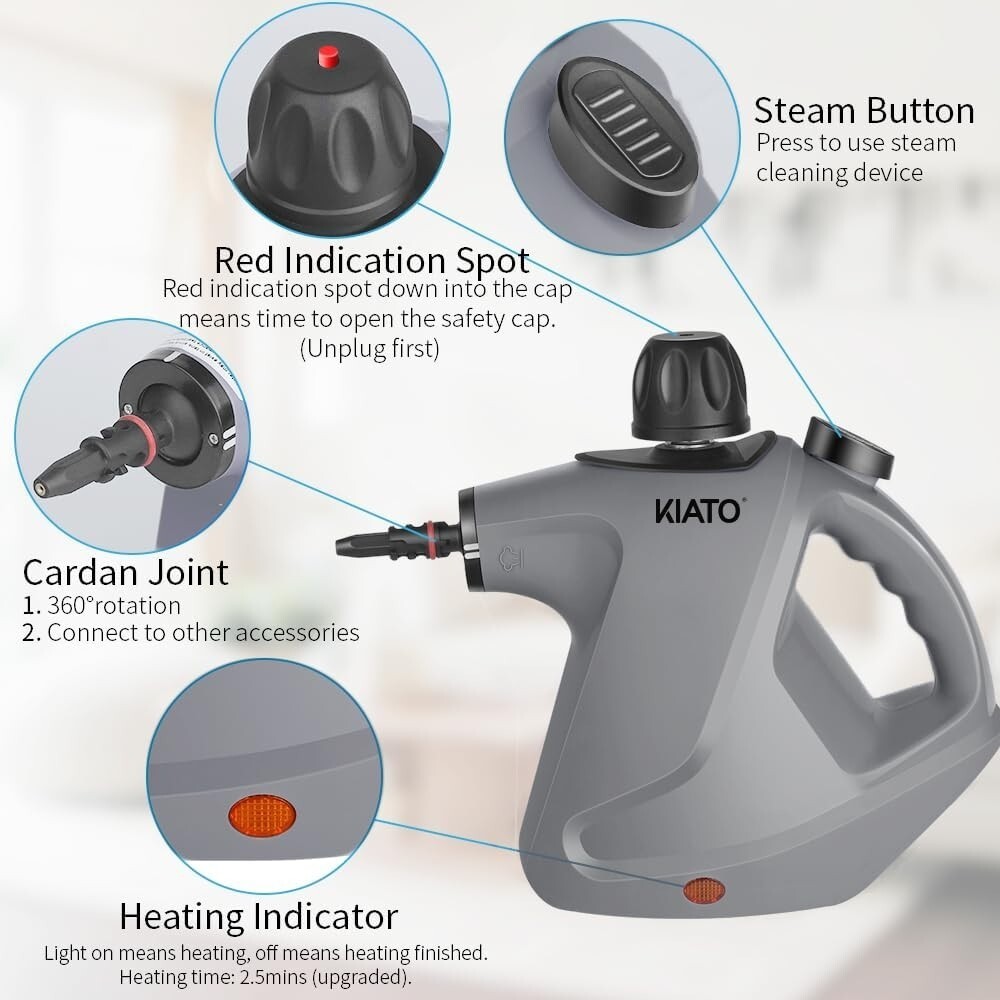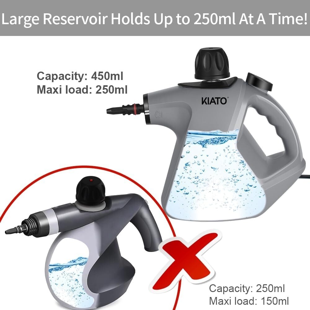 About this item ๐ฐ๐ฑ๐ฌ๐บ๐น ๐๐ฎ๐ฝ๐ฎ๐ฐ๐ถ๐๐ ๐ช๐ฎ๐๐ฒ๐ฟ ๐ง๐ฎ๐ป๐ธ๏ผThis handheld steamer for cleaning features an extra large water tank of 450ml capacity(The recommended load capacity is within 250ml so as to leave a certain space to ensure normal use). This large steam cleaner allows you to focus on cleaning, instead of refilling often. Lightweight, portable, and with a long power cord(16.4ft), this handheld carpet cleaner can go further and work distantly. ๐๐ข๐ก๐ฆ๐ง๐๐ก๐ง ๐ฆ๐๐ฒ๐ฎ๐บ ๐ฃ๐ฟ๐ฒ๐๐๐๐ฟ๐ฒ๏ผAdd 250ml water, floor steamer can continuously steam out for about 8 minutes WITHOUT INTERVALS, unlike other car carpet cleaner that has to stop to build the pressure after every 1 or 2 minutesโ spraying(Some rug cleaner may just work for 20 seconds at a time and so you have to wait and wait for it to heat up).Our upgraded pet carpet cleaner does save your time and boost your efficiency. ๐ฃ๐ผ๐๐ฒ๐ฟ๐ณ๐๐น๐น๐ ๐๐น๐ฒ๐ฎ๐ป ๐๐ต๐ฒ ๐ง๐ผ๐๐ด๐ต๐ฒ๐๐๏ผKiato handheld steam cleaner, working over 1050-1150 watts, can emit 105โ(221โ)high pressured flow of steam that is excessively powerful to deeply clean and make things in your home โnewโ again with no effort. Aim this upholstery cleaner at stain,grime, even the hard gooey spots that regular cleaning cannot dissolve, it melts right off, the only thing you need to do is to gently wipe up the leftover and then done! ๐ญ๐ฌ-๐ฝ๐ถ๐ฒ๐ฐ๐ฒ ๐๐ฐ๐ฐ๐ฒ๐๐๐ผ๐ฟ๐ ๐ฆ๐ฒ๐๏ผThis steamer does an amazing job of cleaning and ironing. Plus 10-piece accessory kit such as: angled nozzle, bendable extension, nozzle with brush, fabric steamer tool, rubber wiper for window/door, and many other extras. Itโs all-purpose and can go and clean out any hard to reach gaps, corners, angles, and also various surfaces/materials: kitchen sink, countertop, BBQ grill, toilet, floor, kidsโ toy, pet mattress, car, sofa, and clothing. ๐๐ต๐ฒ๐บ๐ถ๐ฐ๐ฎ๐น-๐ณ๐ฟ๐ฒ๐ฒ ๐ฎ๐ป๐ฑ ๐๐ฒ๐ฎ๐น๐๐ต๐๏ผThis portable carpet steamer cleans by hot pressured steam to remove dirt and grease. No chemical residue on your utensils, pet mattresses, kidsโ toys.Stop using the harsh chemicals dear, never take chances with your familyโs health anymore, try this couch cleaner, you will surely appreciate such a helpful and safe cleaning wizard and definitely go crazy with it.