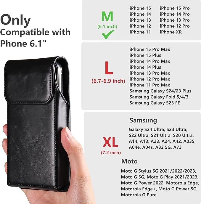Feature: [Premium Durable PU Leather] The elegant phone holster is made of high-quality PU leather materials with metal belt clip, which not only shows a stylish and unique texture, but also protects your phone from scratches and damage. [Two-Ways to Carry] The flip phone holster has a belt clip and double belt loop. No matter wear a belt or not, you could clip the phone holster to anywhere you like,very convenient to use. The double belt loops are 2 inches wide to ensure that the cell phone belt holder is held tightly on your belt. [Secured Closure] The highly-efficient sturdy magnetic cover of phone pouch can be opened and closed safely and ensure the inside phones in place, slide the phone in and out easily. [Occasions] Suitable for construction work, camping, hiking, outdoor-living, cycling and hiking, etc.. It can also be used as a waist bag, utility belt pouch, outdoor hiking bag, or travel pouch. So convenient to use. Size: Medium is widely compatible with iPhone 15, iPhone 15 Pro, iPhone 14, iPhone 14 Pro, iPhone 13, iPhone 13 Pro, iPhone 12, iPhone 12 Pro, iPhone 11, iPhone 11 Pro, iPhone XR, Samsung Galaxy S24, Samsung Galaxy S23, Galaxy S22, Galaxy S21. Large is widely compatible with iPhone 15 Pro Max, iPhone 15 Plus, iPhone 14 Pro Max, iPhone 14 Plus, iPhone 13 Pro Max,iPhone 12 Pro Max, iPhone 11 Pro Max, iPhone XS Max, Samsung Galaxy S24+, Galaxy Fold 5/4/3, Galaxy S23+ and other folded phones. X-Large is widely compatible with Samsung Galaxy S24 Ultra, Galaxy S23 Ultra, S22 Ultra, S21 Ultra, S20 Ultra, Note 20 Ultra 5G Note 10+ Plus 5G, Google Pixel 7 Pro, Pixel 6 Pro. Package included: 1 x Holster