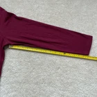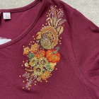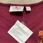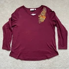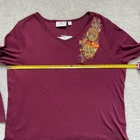 Get into the holiday spirit with this gorgeous maroon knit shirt from Quacker Factory. The shirt features a V-neckline, long sleeves with casual cuffs, and a pullover closure. It is made of a soft cotton blend fabric with a stretchy knit texture that is perfect for the fall season. The shirt is adorned with beautiful rhinestone and embroidered accents that add a touch of sparkle to your outfit. It is collarless and has a regular fit, making it perfect for both travel and casual occasions. Hand wash only for optimal care. Available in size L, this shirt is a must-have for any woman's wardrobe. Please review photo for details, measurements and condition