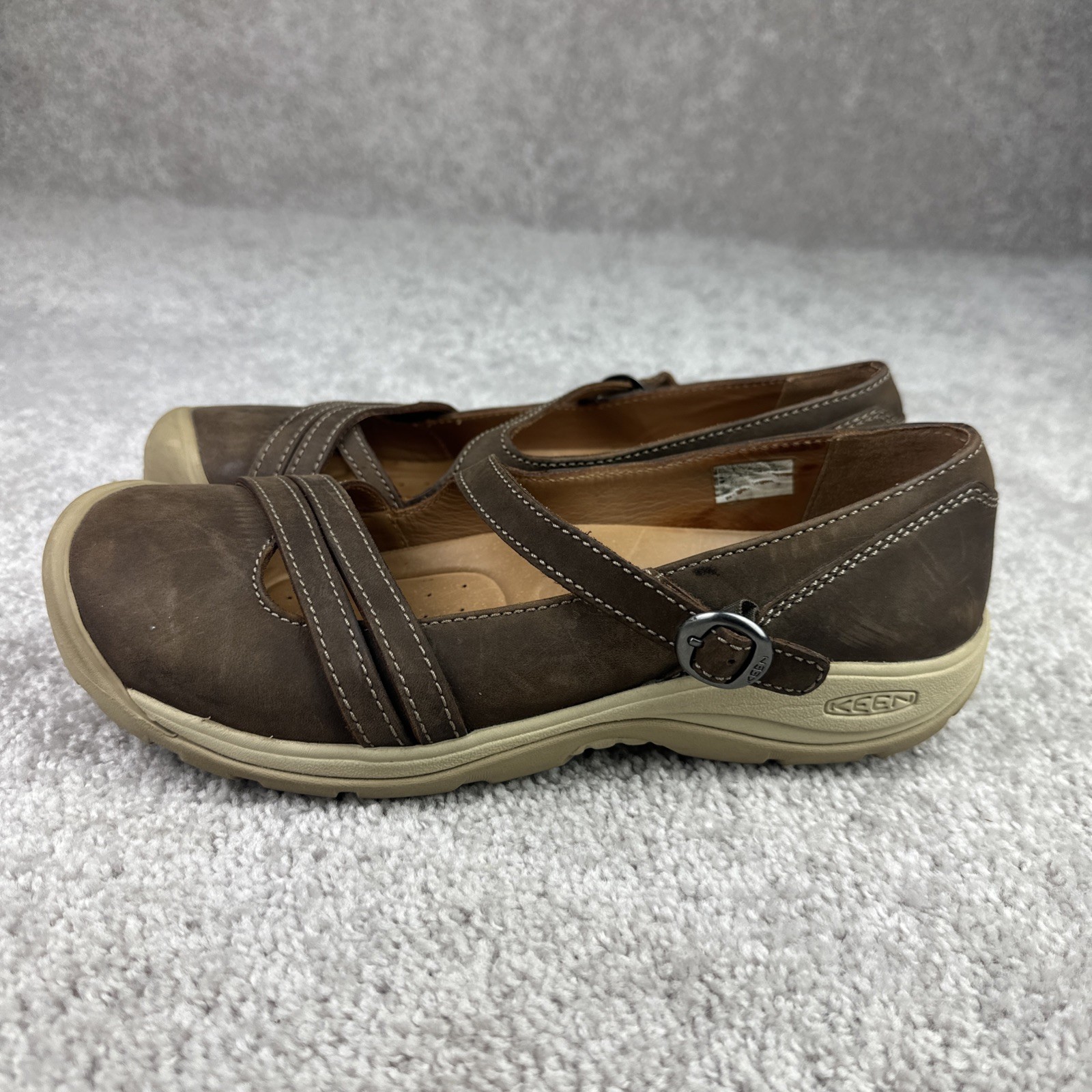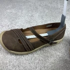 *Size tag is missing and cant read, measurements in picture and seem to be an 11 but double check for your size* The Keen Presidio II Mary Jane Shoes in brown leather are a comfortable and stylish option for women. These cross strap shoes feature a round toe, flat heel, and adjustable buckle closure for a perfect fit. Designed for travel, activewear, and casual occasions, these Mary Jane shoes are cushioned, lightweight, and have a non-slip outsole, making them ideal for walking and hiking. With a modern and classic style, these shoes are perfect for the summer, fall, and spring seasons. The leather lining, foam insole, and adjustable straps provide added comfort and flexibility for all-day wear.
