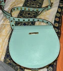 {{{{This purse has a few light tiny stains so it may need a good wipe-down but other than that it’s in pristine condition!! }}} Elevate your style with this beautiful Rebecca Minkoff Skylar Cross Body Handbag. The bag features a stunning turquoise exterior and a gold hardware color that adds a touch of elegance to your outfit. It has a magnetic snap closure that keeps your belongings secure and a laser cut in front, smooth finish in back that gives it a unique and modern look. The bag has a small size, measuring 4 inches in height and 7 inches in length, making it perfect for a day out or a night on the town. It has a detachable strap that allows you to carry it comfortably and an adjustable strap with a drop of 28 inches. The bag is made of high-quality leather and has a tan design lining material that complements the overall look of the bag. This Rebecca Minkoff Skylar Cross Body Handbag is a must-have for any fashion-forward woman.