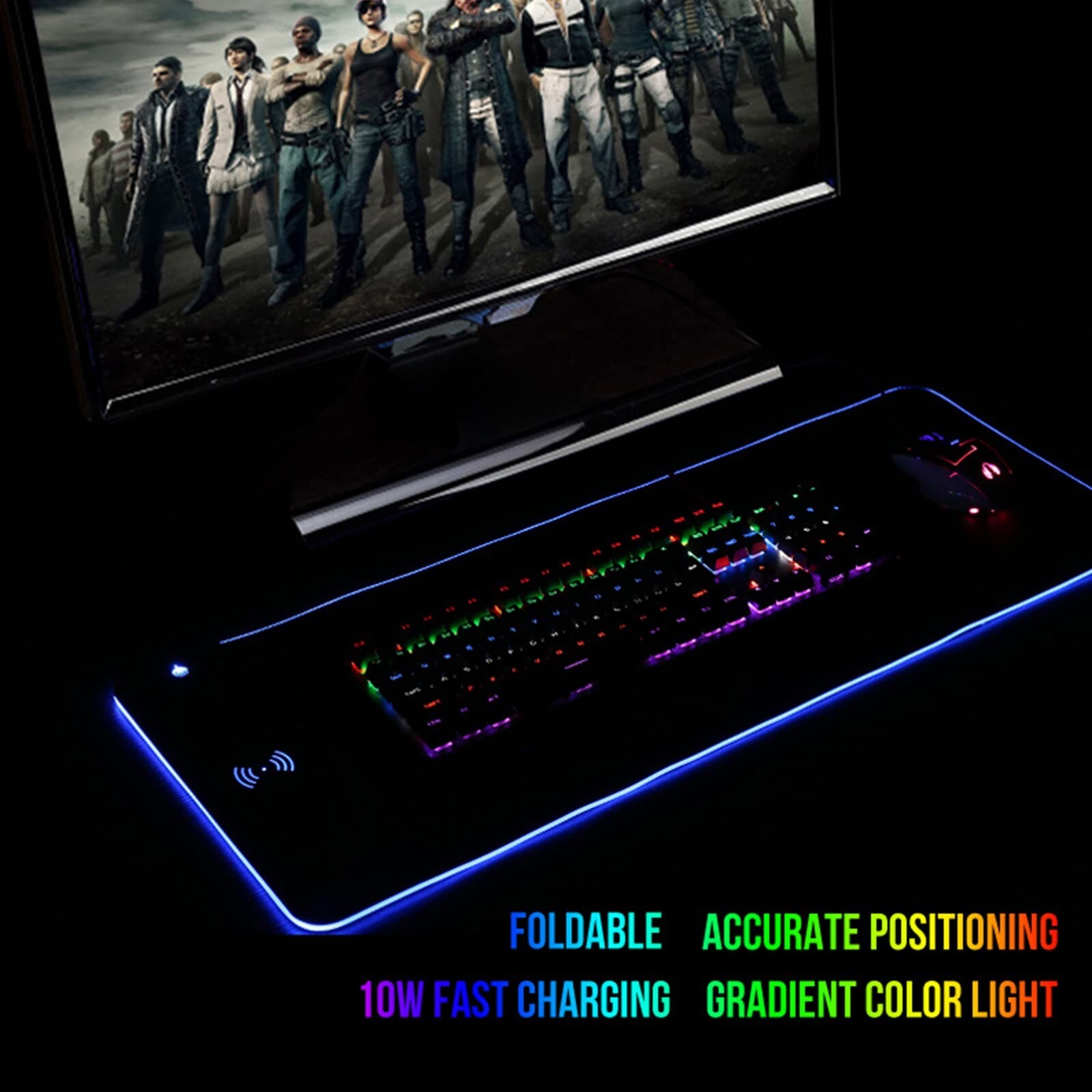 RGB Wireless Charging Mouse Pad,Large Gaming Mouse Pad Mat with Wireless Charging 7 Static Light Modes and 3 Dynamic Modes Waterproof Keyboard Mat Product Details Brand: COOSKIN Color: Black Special Feature: Waterproof, Non-slip, RGB, wireless charging Material: Rubber Product Dimensions: 31.49"L x 11.8"W Brand: COOSKIN Item model number: FSD-1602 Hardware Platform: PC Item Weight: 1.92 pounds Product Dimensions: 31.49 x 11.8 x 0.1 inches Item Dimensions LxWxH: 31.49 x 11.8 x 0.1 inches Color: Black Manufacturer: Shenzhen Zhong Teng Fei Electronic Technology Co.Ltd Country of Origin: China Date First Available: December 19, 2022 Wireless Charging Mouse MatBuilt-in wireless fast charging compatible with smartphones which support wireless charging , and all other Qi-enabled devices rgb large gaming mouse pad with wireless charging 7 Static light modes and 3 dynamic modes adds to the beauty of your gaming setup 3 charging modes indicatorBlue for standby mode,Red for charging, Green for full charged, The red light will flash if the phone is not placed correctly mouse pad wireless chargerOur RGB mouse pad offers The super smooth cloth surface is specially made for gamers for accurate tracking;The cloth surface is water-proof Non-slip large mouse pad with 4 mm thickWith anti-slip base, this mouse pad keeps super firmly on the desk and provides heavy grip. Size 800x300x4MM