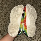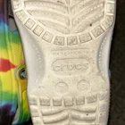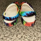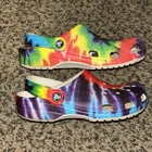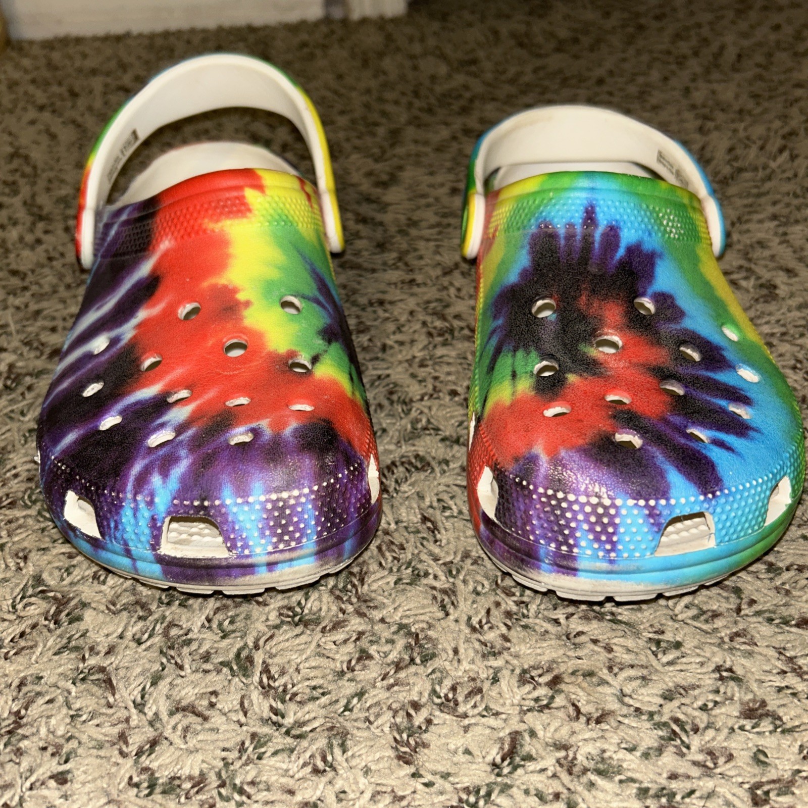 The Crocs Rainbow Tye Dye Clogs Sandals in women's size 9 or men's size 7 are colorful and comfortable footwear perfect for various occasions such as travel, activewear, casual outings, or workwear. These slip-on sandals feature a round toe shape, flat heel, and cushioned insole for added comfort. The tie-dye pattern adds a fun and vibrant touch to the classic Crocs design, making them a stylish choice for the summer, fall, and spring seasons. Made of rubber with a breathable lining, these clogs are easy to wear and suitable for walking, beach activities, or school.