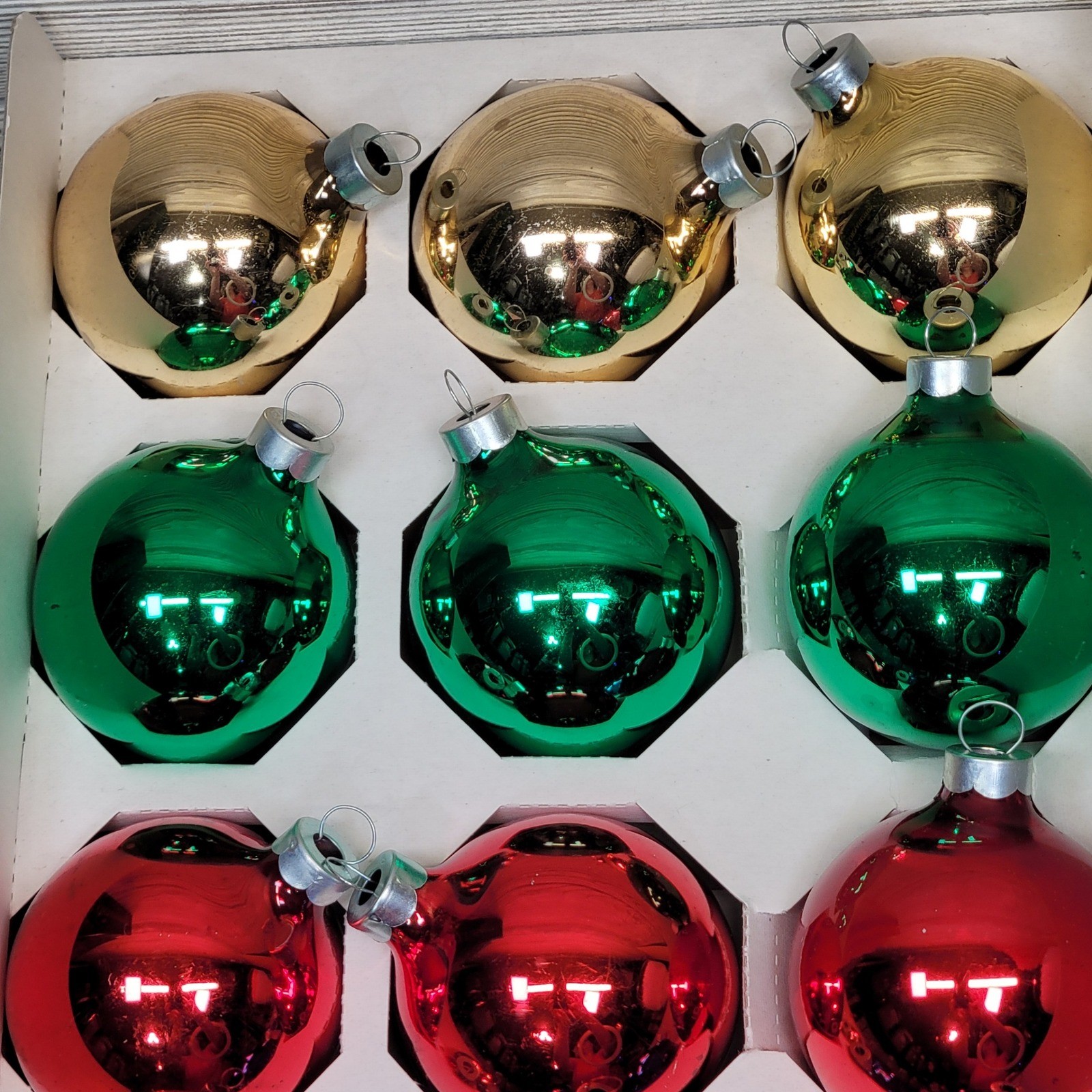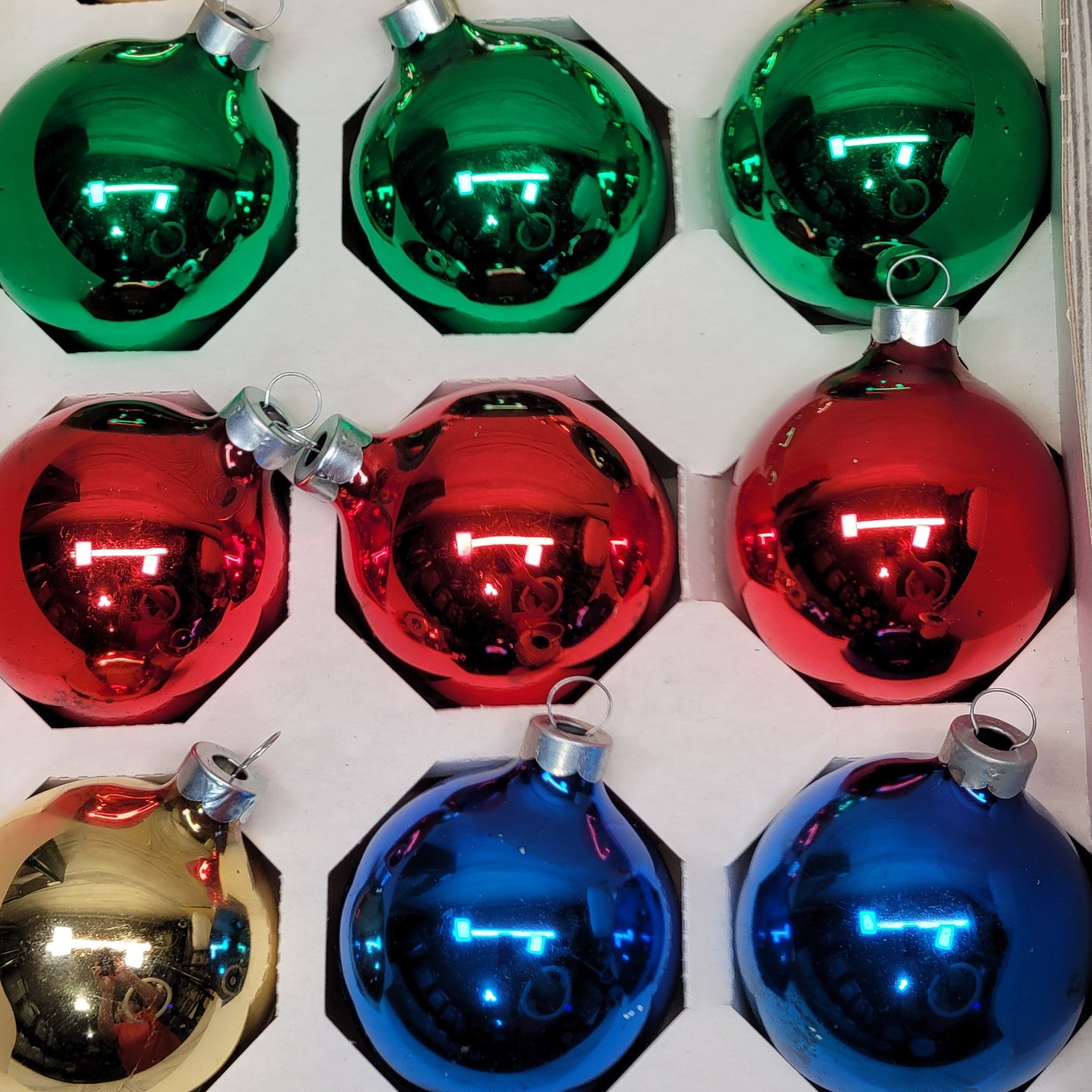 Keywords: Rauch Christmas ornaments, Vintage glass ornaments, Shiny Christmas balls, Red green blue gold ornaments, Set of 12 ornaments, Christmas tree decorations, Holiday decor, Retro Christmas, Glass baubles, New old stock ornaments, Handcrafted ornaments Light wear/discoloration from age/use. See all pictures.
