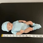 Realistic-looking baby girl doll in a blue onesie, socks, and beanie cap. Life-like features including under the onesie. Her eyes stay shut. Approximately 12" long. Great pre-owned condition. Please see the photos for more details. practice baby - toy - cute - gift