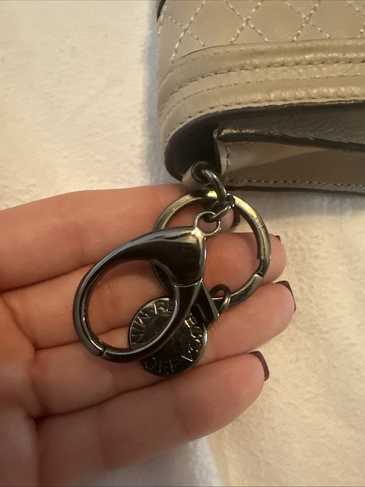 Rebecca Minkoff wallet Tan with keychain. Black/ Silver Chain and hoop. Condition is Pre-owned. Shipped with USPS Ground Advantage.