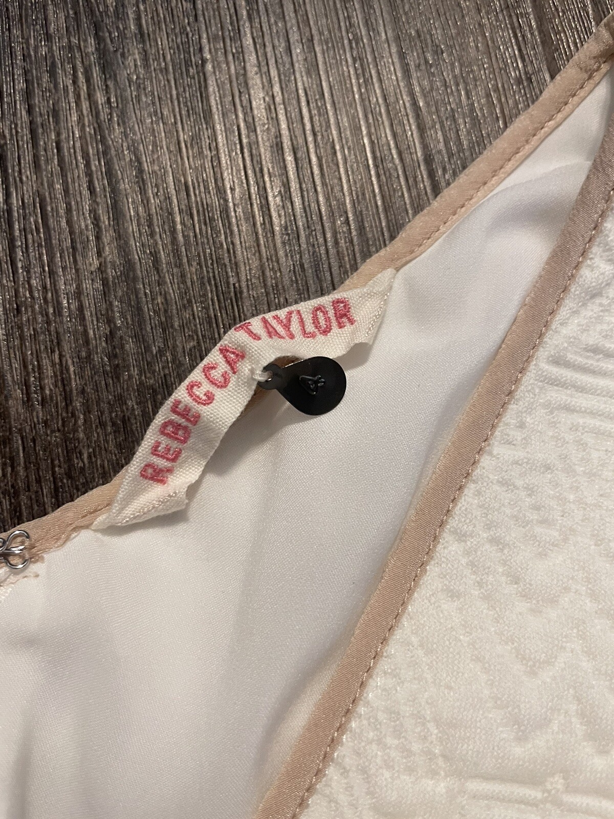 Rebecca Taylor Blouse size 4 zips almost all the way in the back v- neck in front and back mesh sleeves open spots in the back double lined lining is 100% polyester shell fabric is 75% nylon and 25% cotton combo fabric 88% silk and 12% elastane combo fabric 100% silk