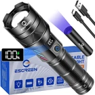 [2024 UPGRADED HIGH BRIGHTNESS & LONG RANGE LED] The ESGREEN ED0330 rechargeable flashlights high lumens is made of a upgraded PH-L330 30W LED which has a feature of high brightness and ultra long beam. The high powered flashlight provides ultra high brightness, it can easily illuminate the whole room and backyard. The ultra strong beam provides high concentration circle beam, so it can easily and clearly focus on objects up to 5000 feet away. It is ideal for camping, hiking, dog walk, riding etc [NEWEST LUMINOUS DESIGN & IMPROVED LCD DIGITAL POWER DISPLAY] Different with others, the powerful flashlight rechargeable is inset 6pcs of luminous strip on the head, it can light up with different colors in dark, with compact handheld size, it looks beautiful and quite cool. It is equipped with a LCD power display that shows remaining battery power exactly, so that you will get known when to charge it in advance. It is the ideal gift for a father, husband, wife or student. [MULTI-FUNCTIONAL 2 IN 1 - FAST USB C CHARGING & DISCHARGING FUNCTION] The handheld LED flashlight high lumens rechargeable is built-in 2 USB interfaces, one is USB C input for charging, the other is USB output which can charge your smartphone, earphone or any other USB devices, it is convenient to get charged in indoor or outdoor activities. [LONG LASTING & OVERCHARGE PROTECTION] The super bright led flashlight is equipped with 1pcs 6000mAh rechargeable battery, so it can provided up to 15 hours of powerful and non-diminishing brightness. Both the battery and flashlight are built-in a smart chip that has the function of overcharging protection to ensure safety. [BRIGHTNESS & FOCUS ADJUSTABLE] According to your needs and the environment, you can adjust the brightness and focus. Press the button to switch light modes, long press for 3s to turn off directly at any mode. There are 5 modes: high-middle-low-strobe-SOS. The SOS and strobe mode are usually used for emergency situations such as car breakdown or get lost at night. Push or pull the head to adjust the focus, it can create brilliant large-area floodlight or perfectly spotlight. [PRACTICALLY INDESTRUCTIBLE & IPX7 WATERPROOF] The led camping flashlight body is made of super hard aviation-grade aluminum alloy, impact resistance, wear-resistant and drop-resistant. It is strong enough to withstand a 10 feet accident drop and even ran over by a truck, it still works! IPX7 waterproof flashlight has a built-in high tenacity seal rubber waterproof ring, so there is no any problem to be used in any bad weather, such as rain or snow. [PACKING LIST & EXCELLENT CUSTOMER SERVICE] You will get 1x heavy duty flashlight rechargeable,1x 365nm UV mini rechargeable flashlight, 1x rechargeable 6000mAh battery, 3x AAA Alkaline batteries,1x USB C cable, 1x holster. We are providing high quality products and the best customer service as our aims. You will be pleasantly surprised by the brightness, quality, longevity and performance of the high power flashlights. If you have any questions about this flashlight, please feel free to contact Product Description The video showcases the product in use. The video guides you through product setup. The video compares multiple products. The video shows the product being unpacked. 1 Full Packing List 2 UV Flashlight Included 1 Wide Beam-Flood 2 Narrow Beam-Spot 1 Waterproof 2 Heat & Cold Resistance 3 Shockproof 1 USB Charging/Discharging 2 Long Lasting