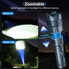 🌈【High Brightness, Long Range】The high power flashlight features the upgraded xhp160.5 chip. This rechargeable flashlight produces up to 900,000 lumens of ultra-high output and is 300% brighter than older models. It can easily illuminate a 3000 square foot room or focus on objects up to 3500 feet away. 🌈【6 Brightness Modes】high lumens flashlight boasts 6 versatile modes (Super Strong /Strong / Medium / Low / Strobe / SOS) that can be easily toggled to suit your needs. It is ideal for a wide range of activities such as camping, hiking, fishing, running, cycling, power outages, emergencies, targeted searches, and general household use. Furthermore, the individually set mode button on the powerful flashlight makes it easier to operate. 🌈【High Power Flashlight】The rechargeable flashlight features a fast charging chip that charges 50% faster than the old model and can work for approximately 8-20 hours on a single charge. It also uses a hidden positive and negative charging port, enhancing its dustproof and waterproof abilities. Moreover, the high power flashlight includes a power output function, allowing you to use it as a power bank to charge your devices via cable. 🌈【Multiple Protection, Safe and Secure】The super bright flashlight is designed with multiple circuit protection functions, including overcharge protection, overdischarge protection, overvoltage protection, and short circuit protection. These features not only make the flashlight's performance more stable, but also significantly extend the service life of the high powered flashlight. 🌈【Zoomable Adjustment】The rechargeable LED flashlight has a telescopic zoom function for switching between spotlight and floodlight modes. Zooming out the head activates the spotlight mode for long-distance observation, while zooming in switches to the floodlight mode for close-range lighting and clear visibility. Click to brighten up the night sky with this handheld flashlight.