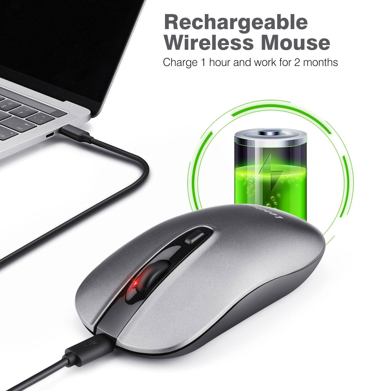 Smooth Navigation with Less Noise Mouse Click - Slim ergonomic design and smooth frosted surface for an incredible user experience. Quieter and Easier to click, make you concentrate on your work without disturbing others beside you. Rechargeable Optical Mouse - Built-in durable rechargeable battery, it can be easily charged using the included USB cable without replacing the battery. Just 2 hours charging, you can use it about 120 days. Stable Connection and Power Efficient - The 2.4 GHz wireless mouse provides a powerful, reliable connection, effective up to 15 meters of range. This mouse will auto sleep after 8 minutes of inactivity for power saving, it can be waken up by clicking any button. Universal Compatibility - work with Windows XP, Windows Vista, Windows 7, Mac OS X 10.4 etc.This product is not compatible with macbook pro or other laptops which only have type c ports. Portable and Durable - USB-receiver stays in your PC USB port or stows conveniently inside the wireless mouse when not in use. Perfect for work and entertainment in home or office.