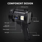About this item: 1、1000,000 Lumen High Brightness Spotlight - Super bright 1000,000 lumen spotlight flashlight with built-in high brightness LED chip, 10 times brighter than other spotlights, bright and steady light. The strong light sweep is about two soccer fields long and has a range of up to 3,600 feet. Our rechargeable spotlight is perfect for outdoor hunting, hiking, fishing and night work. 2、2 CHARGING MODES - High lumen spotlight with built-in 9600 mAh high capacity ΒATERY, guaranteed to charge over 10,000 times.USB CHARGING TIME: 4-6 hrs. Solar charging time: 10-20 hours. It can also be used as a mobile power to charge your cell phone, very convenient.3 blue indicator lights show the remaining power (25%, 50%, 75%, 100%) . This solar spotlight is a great companion when you are out and about! 3、MAIN LIGHT 3 MODES - The main light of the outdoor spotlight has 3 modes: Front Light (High-Medium-Strobe). Penetrates deep darkness, fog and water. Up to 20 hours of run time. Upgraded LED spotlight emits bright, even lumens of white light that is less visually fatiguing and ideal for close up lighting indoors or in work areas. Side Light 2 Modes - Versatile spotlight with 2 modes of side light: Side Light (High-Low). Up to 30 hours run time. Upgraded handheld soft curved handle for comfort and durability. Bi-directional push-button design is easy to use and makes it an ideal gift for family, friends and the holidays. 4、4 COLOR FILTERS & ADJUSTABLE SHOULDER STRAP - In addition to the standard white light, the main light of the handheld spotlight is equipped with 3 colors of interchangeable lenses (Red-Blue-Yellow) to project different colors to meet the needs of different lighting environments. The included shoulder strap makes it easy to carry the spotlight, freeing up your hands during boating, camping and car maintenance. 5、100% SATISFACTION GUARANTEED - The IPX6 waterproof spotlight flashlight brings great convenience for your outdoor travel, allowing you to work in hot, rainy and snowy weather. It is made of sturdy aluminum alloy and ABS material to protect your searchlight from scratches. We promise to serve every customer seriously. Product Description 1000,000 Lumen Brightest Spotlight Flashlight - Turn Night into Day! WHY CHOOSE OUR RECHARGEABLE FLASHLIGHT? 1. BRIGHTEST SPOTLIGHT - Our rechargeable spotlight uses an upgraded P90 led chip, with higher output lumens, up to 1000,000 lumens. Easily illuminate an entire room or focus on objects within 3600 feet. Long runtime make it a quality lighting tool. 2. BRIGHT 5 MODES - Multifunctional spotlight with 5 modes: (1)Main Light(High - Medium-Strobe) . (2)Side Light(High - Medium) . Can penetrate deep darkness, fog and water. 3. 30H LONG RUNTIME - Our powerful spotlight has a capacity of 9600 mAh ΒATTERY, can provide up to 30 hours or more for outdoor lighting activities. 4. FAST CHARGING & POWER BANK - Our flashlight USB fast charging on 4 hours, Suitable for wall chargers and USB charging ports. It can also be used as a power bank to charge your mobile phone. 5. POWER DISPLAY : Our power display allows you to know the remaining power and when it needs to be charged more accurately, which is very convenient. 6. IPX6 WATERPROOF - The waterproof grade of the our flashlight is IPX6, No problem on rainy days! Great for outdoor camping, hiking, night running, dog walking, boating, fishing, climbing, hunting, including home emergencies, garages, power outages, car repairs. Perfect for treating yourself or giving as a gift. Spotlight Flashlight with 5 Light Modes for Your Choice Main Light 3 Modes - Outdoor Spotlight with Main Light 3 Modes: Front Light (High-Medium-Strobe). Run time up to 20 hours. Can penetrate deep darkness, dense fog and water. Side Light 2 Modes - Handheld Spotlight with Dual Side Lights 2 Modes: Side Light (High-Medium). Run time up to 30 hours. Red & blue strobe light for warning and help call. White/Red/Blue/Yellow - Replaceable Lenses : Powerful LED spotlight with 4 color lenses, with high-medium-flash mode. You can cycle through different lighting modes by installing lenses of different colors to meet your lighting needs. Outdoor Spotlight - Supports USB+ Solar Charging. It Can be Charged with Sunlight! A high-conversion solar panel is installed on the back of the searchlight body. The searchlight can be charged by placing it under the sun during the day. Charging is quick and convenient. Solar charging time: 10-20 hours. It is very suitable for outdoor camping, hiking, mountain climbing, and dog walking. It solves the problem of difficulty in charging outdoors and gives you a full sense of security when outdoors! Our Rechargeable Spotlight with USB Input Port & Output Port Fast Charging in 4 Hours: This flashlight can be charged either with a wall charger at home or outdoors with a USB car charger/mobile power supply. As a Power Bank: The spotlight can also be used as a mobile power source to charge your cell phone or laptop in an emergency. Power Display: Rechargeable spotlight with 4 power indicators for more accurate indication of remaining power (25%, 50%, 75%, 100%). Built-in 9600mAh Large-capacity ΒATTERY : The spotlight flashlight is equipped with a 9600mAh large-capacity ΒATTERY, which can provide up to 20 hours of working time in the main light medium brightness mode and up to 30 hours of working time in the bright light mode. Side light medium mode to keep the light bright. Multi-functional Spotlight, Light up Your Life Work IPX6 Waterproof: The LED spotlight adopts IPX6 waterproof design and can withstand harsh environments such as heavy rain, extreme cold, and high temperature. Powerful Spotlights: Sturdy aluminum alloy + ABS design, with extremely high drop-proof performance, very suitable for home or outdoor use. Adjustable Shoulder Strap: Convenient to use and carry. A must-have for the outdoors! Led Spotlight With 4 Color Lenses to Meet The Lighting Needs of Different Scenes Materia