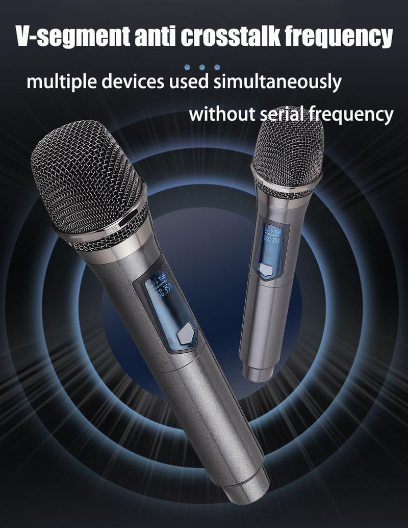【Wireless Freedom】: 200ft operating range (line of sight) to freely move around during performances, suitable for indoor and outdoor activities, such as home karaoke, church, wedding, conference, speech and small stage performance, reliable signal and no worried about the sound will be cut in and out during use. 【Rechargeble Microphone and receive】: No need to purchase additional AA batteries. The microphone and receiver are both built-in 1200 mAh rechargeable lithium-ion battery. work time up to 7 plus hours with charging time 3-4 hours.The charging cable are included in package,support charging the dual microphones and receiver in one cable at the same time.Cool led light ring (working in green,charging in red),and a enhance fashion clear white led display. 【Plug and Play and Multiple Compatibility】:Plug the UHF receiver to a 6.35mm or 3.5mm Mic Jack of audio equipment. Then turn on the receiver and wireless microphones, they will pair to each other automatically.Compatible with devices with 6.35mm (1/4") or 3.5mm (1/8") MIC interface,such as Party speaker, Singing machine, amplifier, PA system, audio interface, truck speaker system, Dome speaker system and etc. 【Clear and Pristine Voice Amplifier】 Comes with high sensitivity professional cardioid dynamic capsule, which picks up clear, pure and full sound, for greater gain while simultaneously eliminating the annoying background noise and howling to some extent.No radiation, Anti-howling, Anti-jamming, constant frequency, Distortion <0.2%. High quality with outstanding audio performance. 【What You Get】 :2 x handheld microphone, 1 x receiver with a 6.35mm plug, 1 x 3.5mm adapter, 2 x anti-slip ring, 2 x mic cover, 1 x USB charging cable, 1 x manual,3 x AA rechargeable batteries . (NOTE: the system is not compatible with phones, computers, or tablets.) Product Description