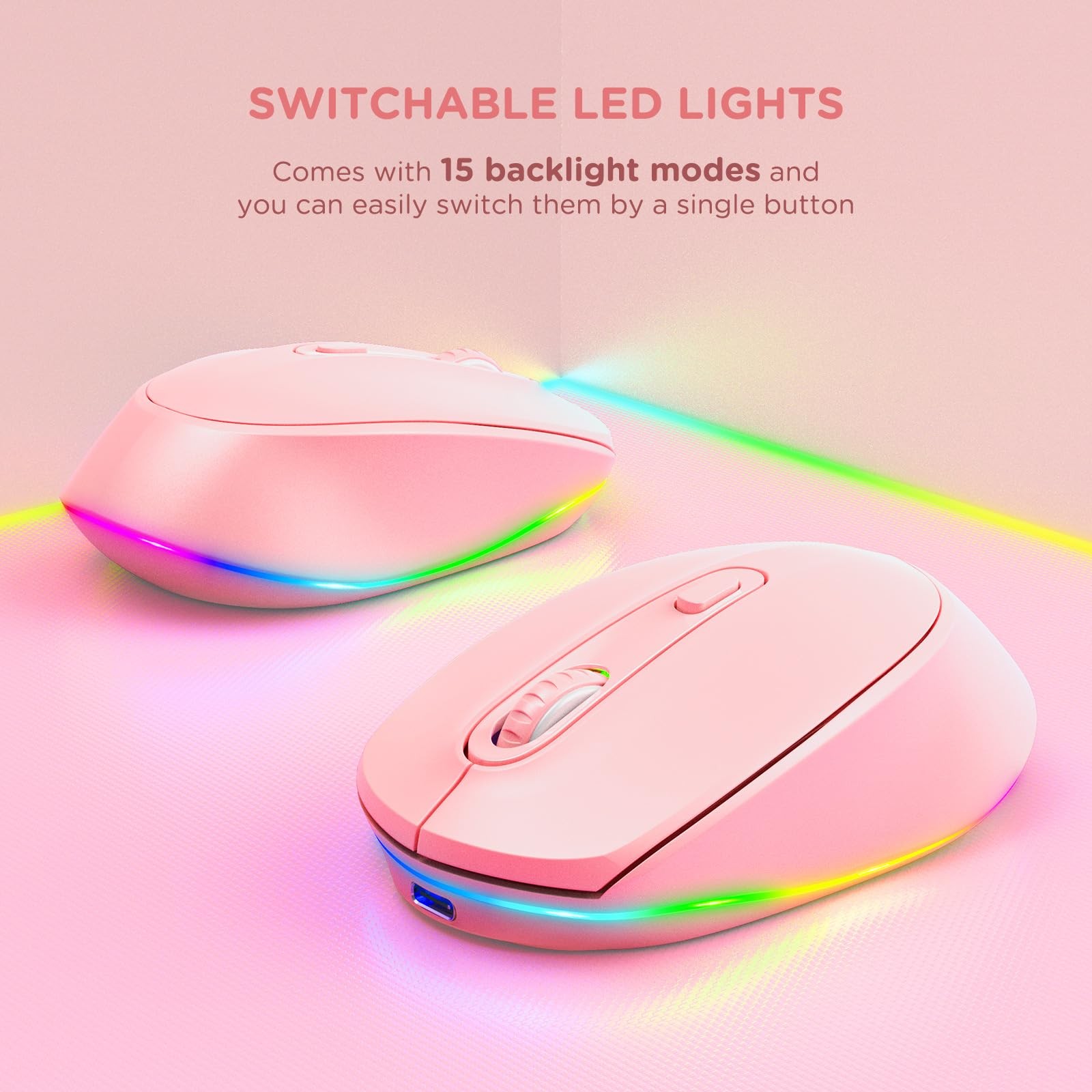 【Light Up Rainbow Mouse】If you are tired of the normal mouse, our wireless rainbow mouse can be a choice for you. It is super cool with 15 different led rainbow lights, and you can easily switch between led colors by pressing the bottom button. It's also a perfect gift for kids, girls,boys, students or left and right hand users 【Universal Compatibility】This wireless mouse works with Computer PC Notebook Laptop tablet with USB port, running on Windows XP, Windows Vista, Windows 7, 8,10,11, Mac OS X 10.4 , Chromebook and more【Notice: If your laptop only have a Type C port, you will need a USB to Type C adaptor to connect it】 【Type C Recharging & Independent ON/OFF Switch】This wireless mouse uses 650mAh rechargeable battery and a single charge would last for a whole week. While the intelligent auto sleep function and on/off switch help you go further between charges 【Ultra Quiet Click】We know your demands of a quiet mouse, so we have reduced the clicking and scrolling noise to up to 90% while you enjoy the same click feel. Perfect for working at home, library, students dormitory,office or even traveling. Thanks to the great ergonomic design, this mouse fits comfortably in your hand, prevent any possible wrist pain 【Driver-Free &3 Adjustable DPI】Comes with a small USB nano receiver(stored in the back of mouse), just plug it into your computer and you are ready to go. 3 Adjustable DPI levels (800/1200/1600) ,set your own cursor speed