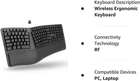 gtin13: Does not apply Brand: Unbranded Keyboard Description: Wireless Ergonomic Keyboard Batteries: 1 Lithium Ion Batteries Required. (included) Features: Plug & Play, Split Keyboard with Wrist Rest, Comfortable Typing, 2.4G Wireless Connectivity, Extended Battery Life, Rechargeable, Large 600 mAh Battery, Includes Charging Cable Type: Ergonomic Item Length: Wireless Ergonomic Keyboard Keyboard Language: English Product Dimensions: 19 X 9.85 X 1.9 Inches Keyboard Layout: QWERTY (Standard) Material: Plastic Connectivity: Wireless, USB-A RF Item Height: Wireless Ergonomic Keyboard Keyboard Backlighting Color Support: Single Color Connectivity Technology: Rf UPC: Does not apply Item Width: Wireless Ergonomic Keyboard Number Of Keys: 110 Item Weight: 2.84 Pounds Style: Wireless Ergonomic Keyboard Color: Black Compatible Devices: Laptop, Pc