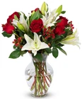 Bring exquisite beauty home with this awe-inspiring Elegance bouquet. This bouquet pairs the most beautiful and elegant flowers together. Oriental lilies, Roses and Hypericum are hand-tied against a backdrop of seasonal greens. Our Elegance bouquet is a timeless centerpiece that will leave you basking in the beauty of this bouquet! For peak freshness, all orders are delivered directly to your doorstep. Please confirm arrival date during order checkout. To add a personal message, select "This is a gift" in your cart or at checkout. Add your name to ensure they know who the sender is. When the flowers arrive, peel back the shipping label to reveal the gift message. Our fresh flower bouquets arrive to you in their bud stage. This ensures smoother travel & longer lasting blooms. Expect the flowers to open within 2-3 days. Flowers are not for human or animal consumption. Remove flowers from the box, trim stems 1 inch & place in a vase with fresh water & flower food. We recommend changing the water often to get more bloom life from the bouquet. Keep out of direct sunlight & extreme heat. This fresh flower bouquet includes Red Roses, Hypericum, White Lilies and Seasonal Greens.