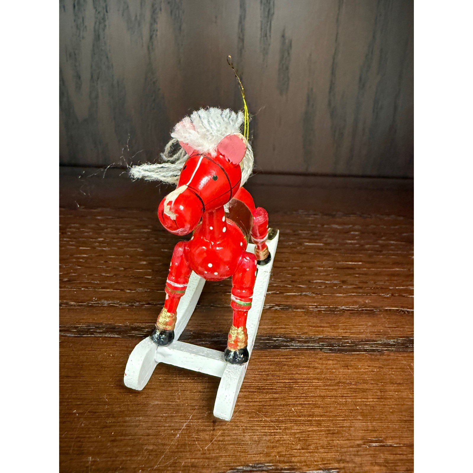 Capture the charm of classic holiday traditions with this delightful wooden rocking horse ornament. Its vibrant red finish adorned with crisp white polka dots instantly evokes festive cheer, while the charming saddle detail and jaunty white mane and tail add a touch of whimsical character. The classic white rocking base, accented with cheerful red stars, completes this endearing piece, promising to bring joy to your Christmas tree year after year. Perfect for adorning your holiday tree, enhancing a mantelpiece display, or adding a festive touch to gift wrapping. Type: Bauble Occasion: Fall Material: Wood, Cardboard Shape: Horse Features: Hanging, Handmade, Embellished Number of Items: 1 Set Includes: Tree Theme: Animals Department: Adults Pattern: Polka Dot Item Height: Less Than 5 in Unit Type: Unit Keywords: rocking horse, wooden ornament, Christmas decor, holiday accent, handcrafted, vintage style, festive, seasonal, tree decoration, whimsical, charming, collectible