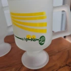 This Tiara pedestral cups set includes four white cups with yellow sunrays and green grass design, perfect for hot or cold beverages. The retro 70s style and vintage design make it a unique addition to any kitchen or home decor. These medium-sized mugs are 8 oz each and feature a painted, decorated design on art glass material. Hand wash only and made in the United States during the 1970s, this original set is a collectible item for all occasions. Great for Irish coffee.