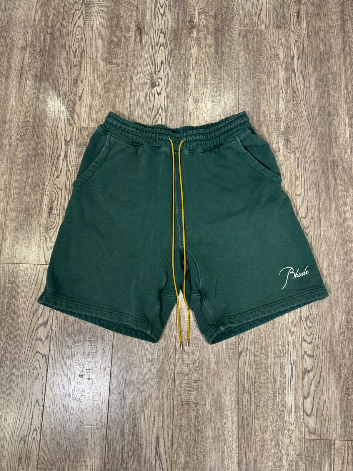 Stay comfortable and stylish in these RHUDE Green Sweat Shorts in size XL. Featuring an embroidered logo on the front, these shorts have a drawstring waist for a customizable fit. The back pocket provides convenient storage, making them perfect for casual wear or activewear occasions. Purchased on SSENSE proof of purchase available upon request measurements shown in photos please contact if you have any questions