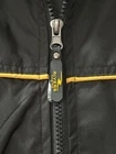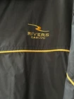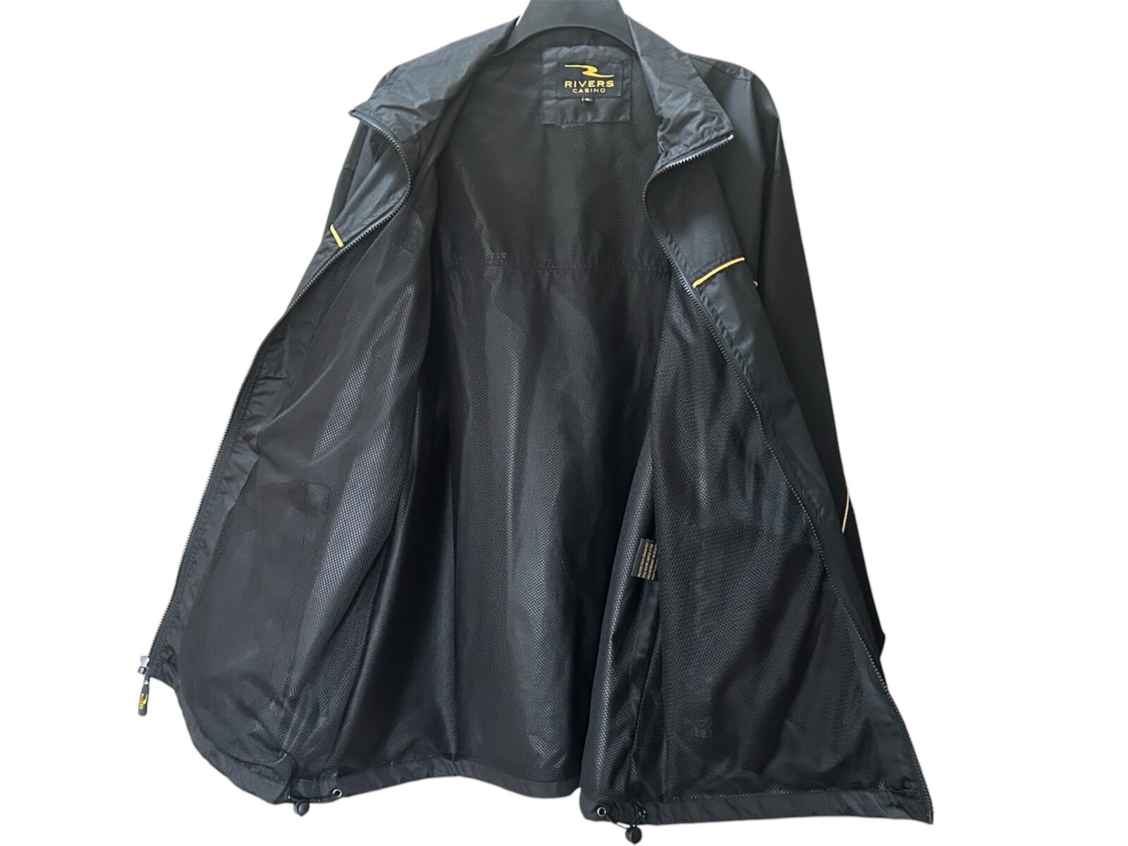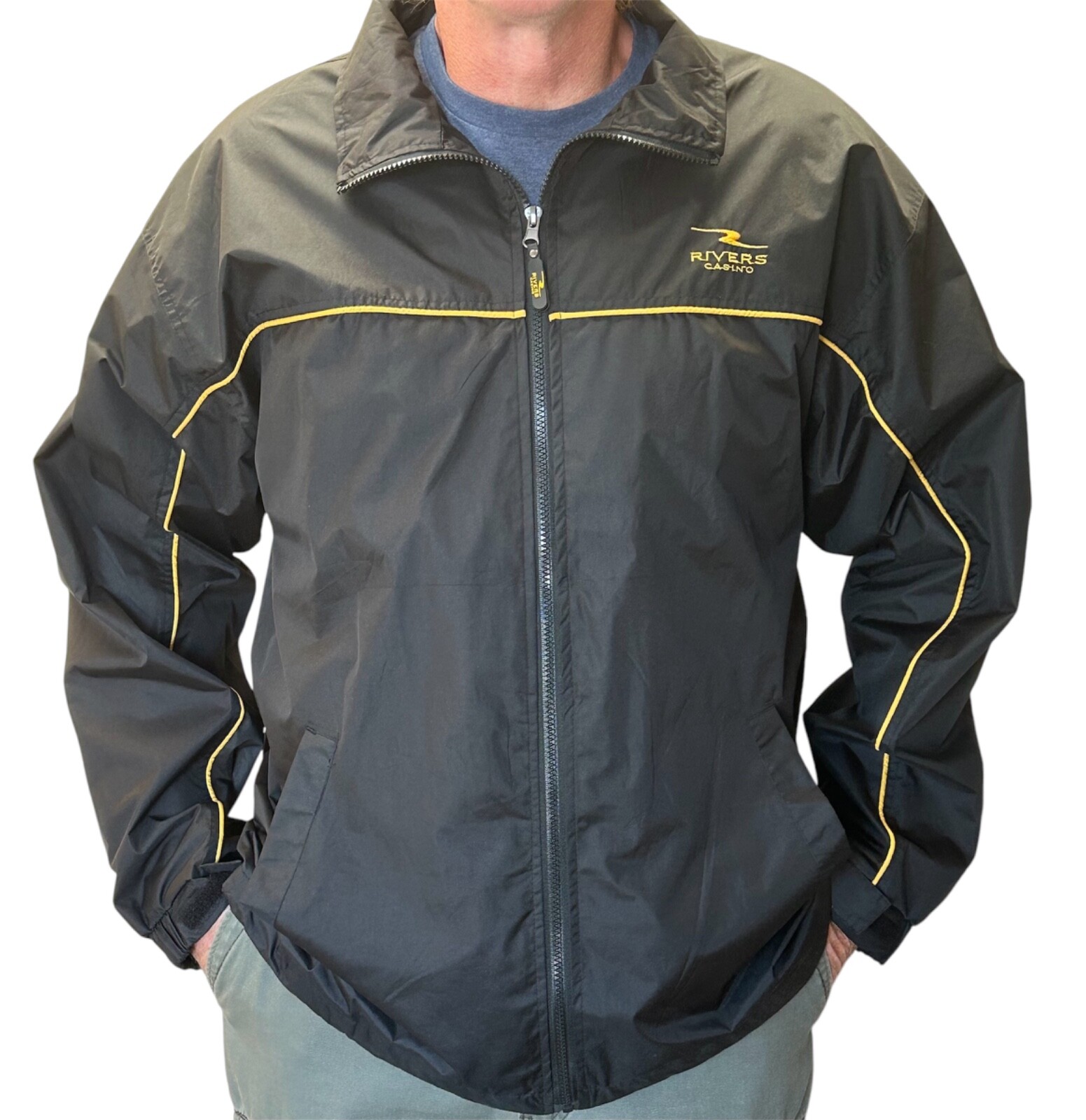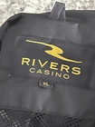 Rivers Casino, black with gold stripe windbreaker, waterproot, long sleeve mesh lined, medium weight jacket in size XL Beautiful jacket in excellent pre-loved condition. No flaws or defects. Jacket has two hip pockets, Velcro adjustable cutts, full zipper, and adjustable drawstring bottom. it has mesh lining inside and is perfect for wind and rain. Medium weight. Not flimsy. Jacket measures approximately 25 inches across from side to side and 30 inches in length. This might easily also fit a size XXL. 100% polyester and machine washable Please see all photos for close-up and measurement details. All my items come from a smoke-free home I am a seller with a five star rating and speedy same-day shipping. Rivers casino Pittsburgh Steelers windbreaker fall winter snow rain Warm cozy relaxed fit Activewear streetwear embroidered mesh monogrammed retro